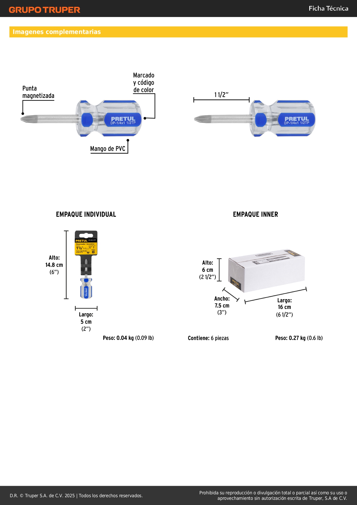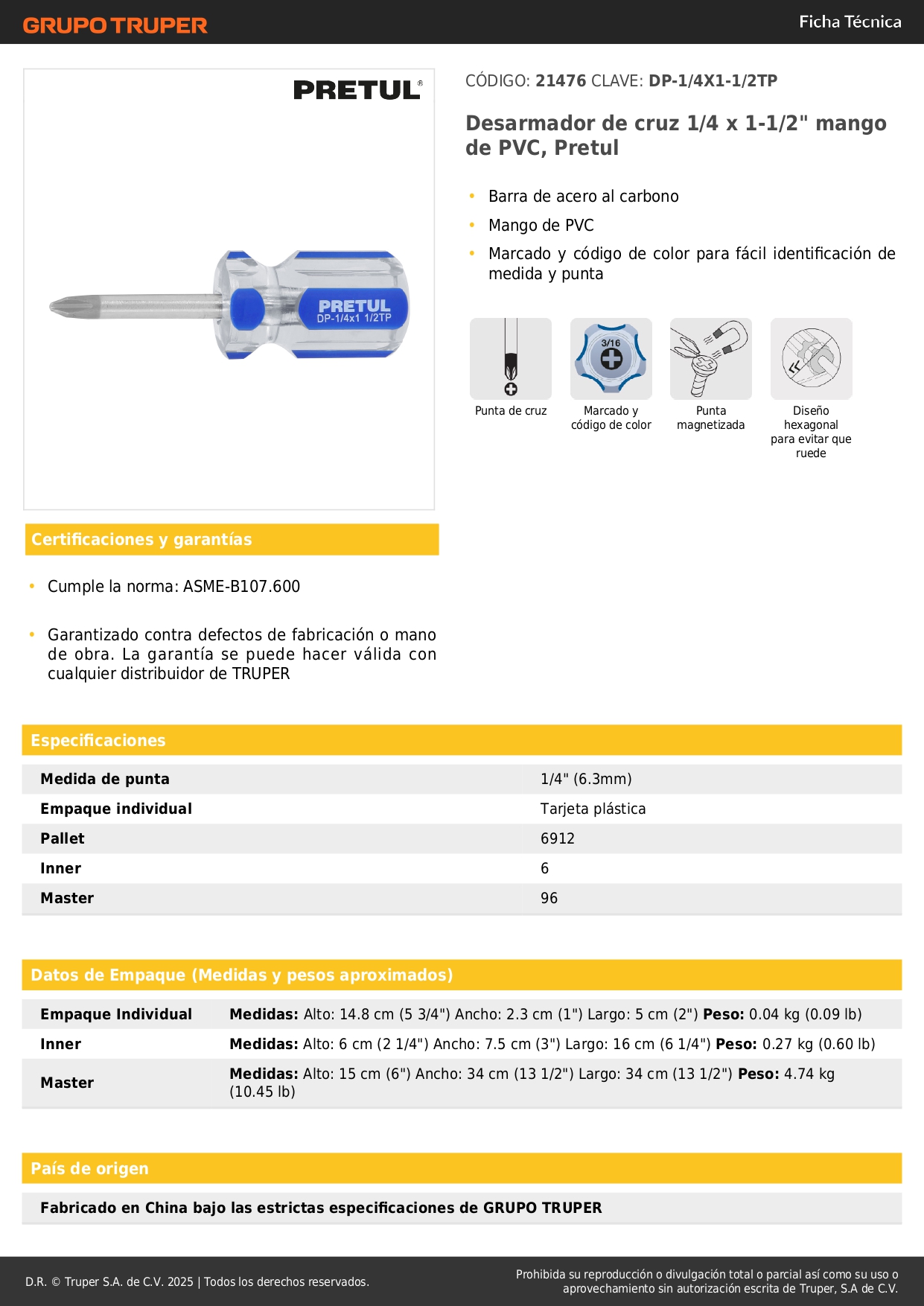 Desarmador de cruz 1/4 x 1-1/2´´ mango de pvc, pretul S/ 3.60 Agregar al carro Avísame cuando llegue -Barra de acero al carbono-Mango de PVC-Marcado y código de color para fácil identificación de medida y punta