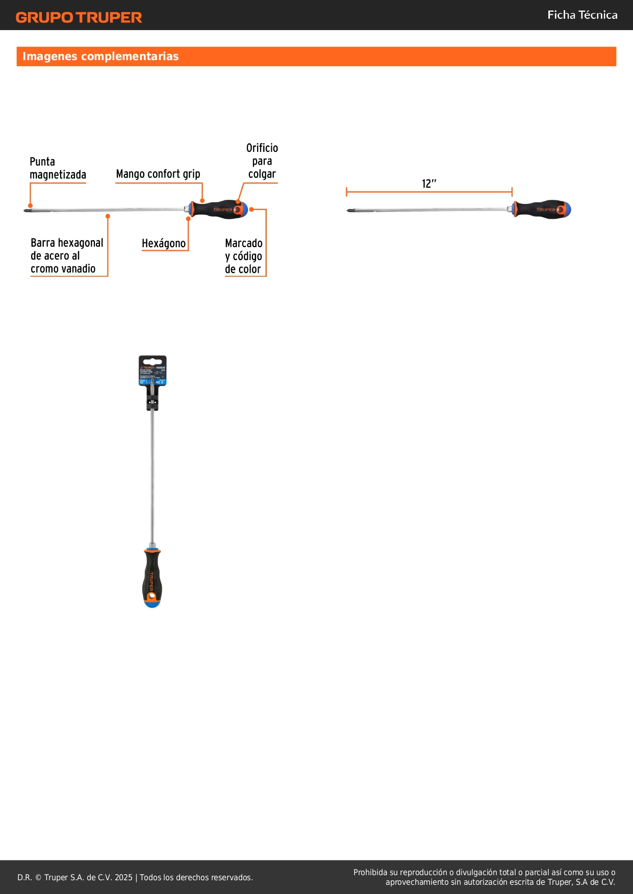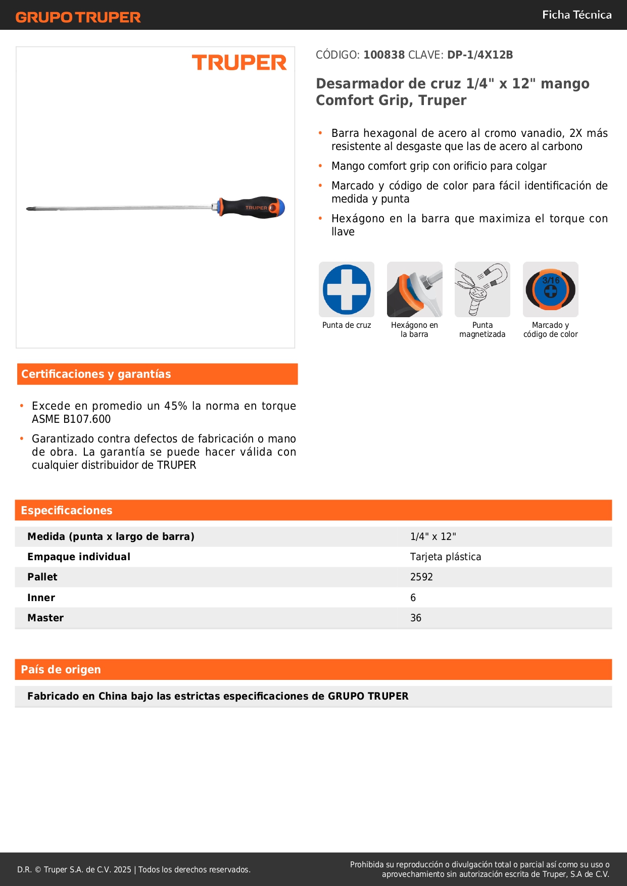Desarmador de cruz 1/4´´ x 12´´ mango comfort grip, truper