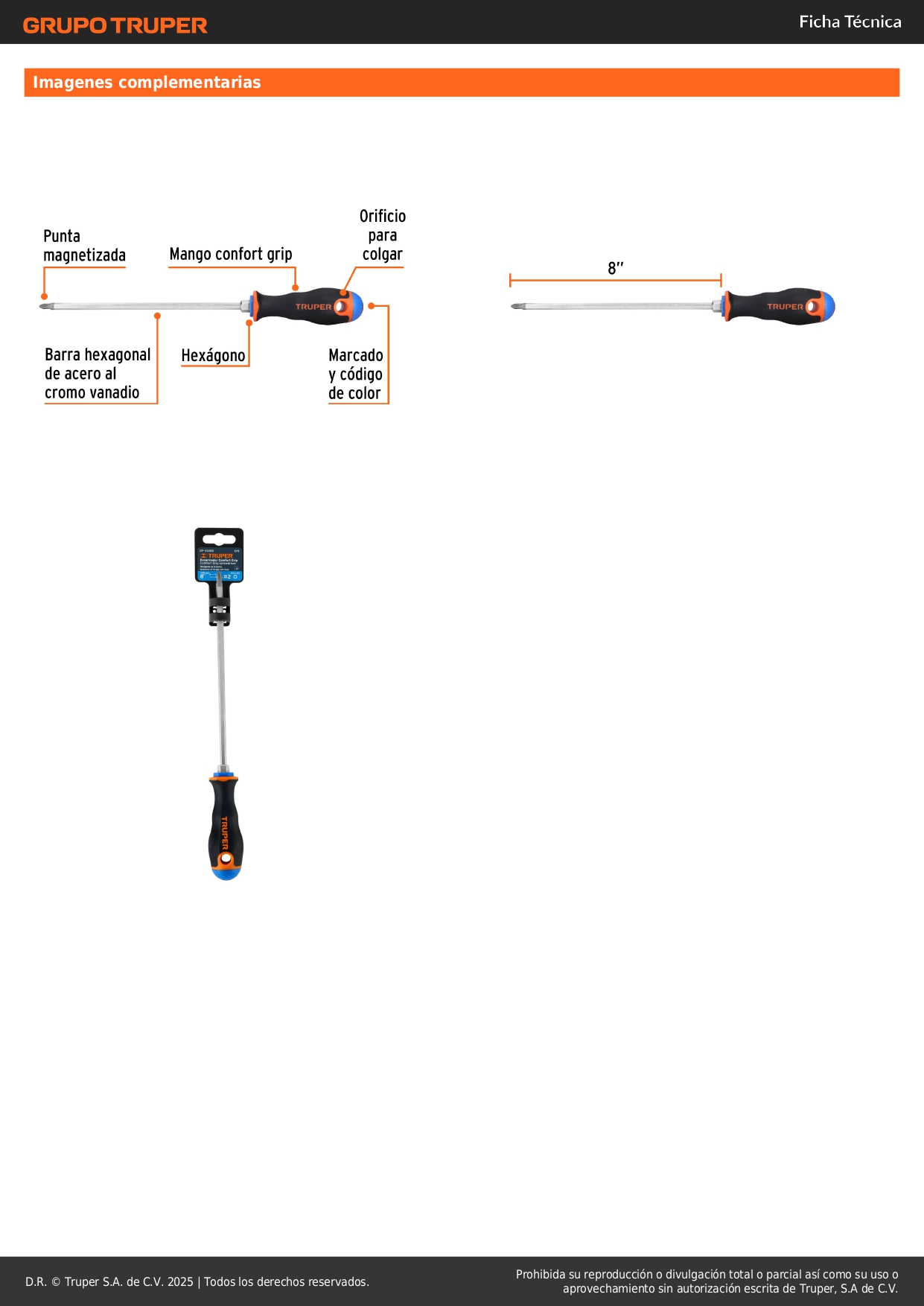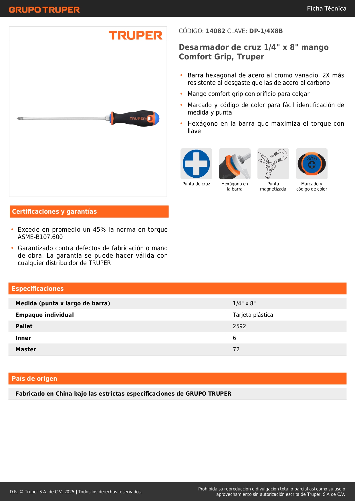 Desarmador de cruz 1/4'' x 8'' mango comfort grip. truper