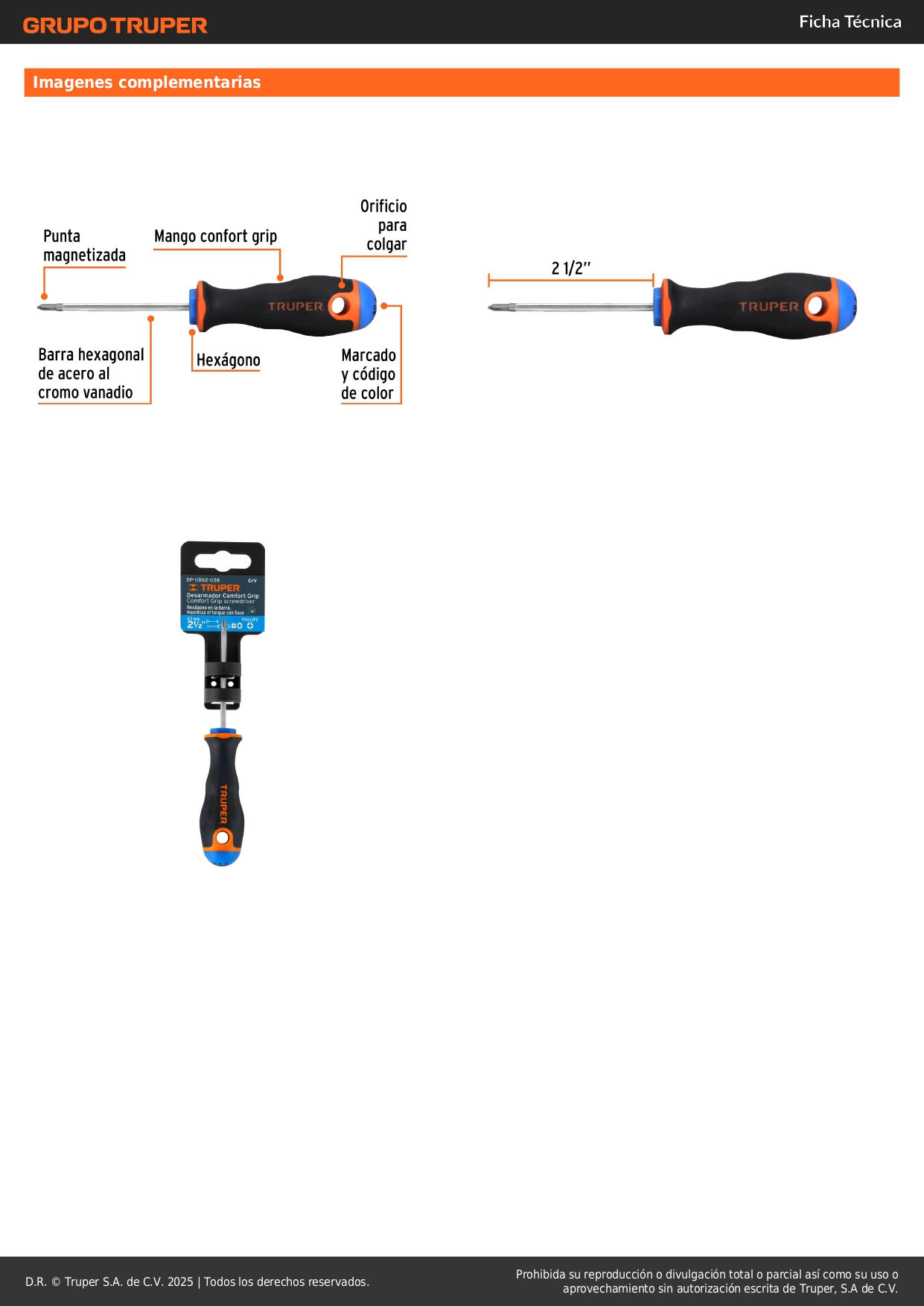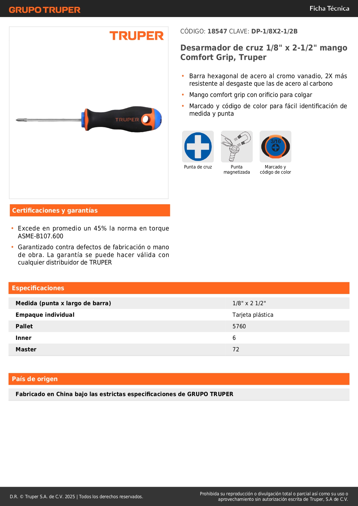 Desarmador de cruz 1/8´´ x 2-1/2´´ mango comfort grip, truper