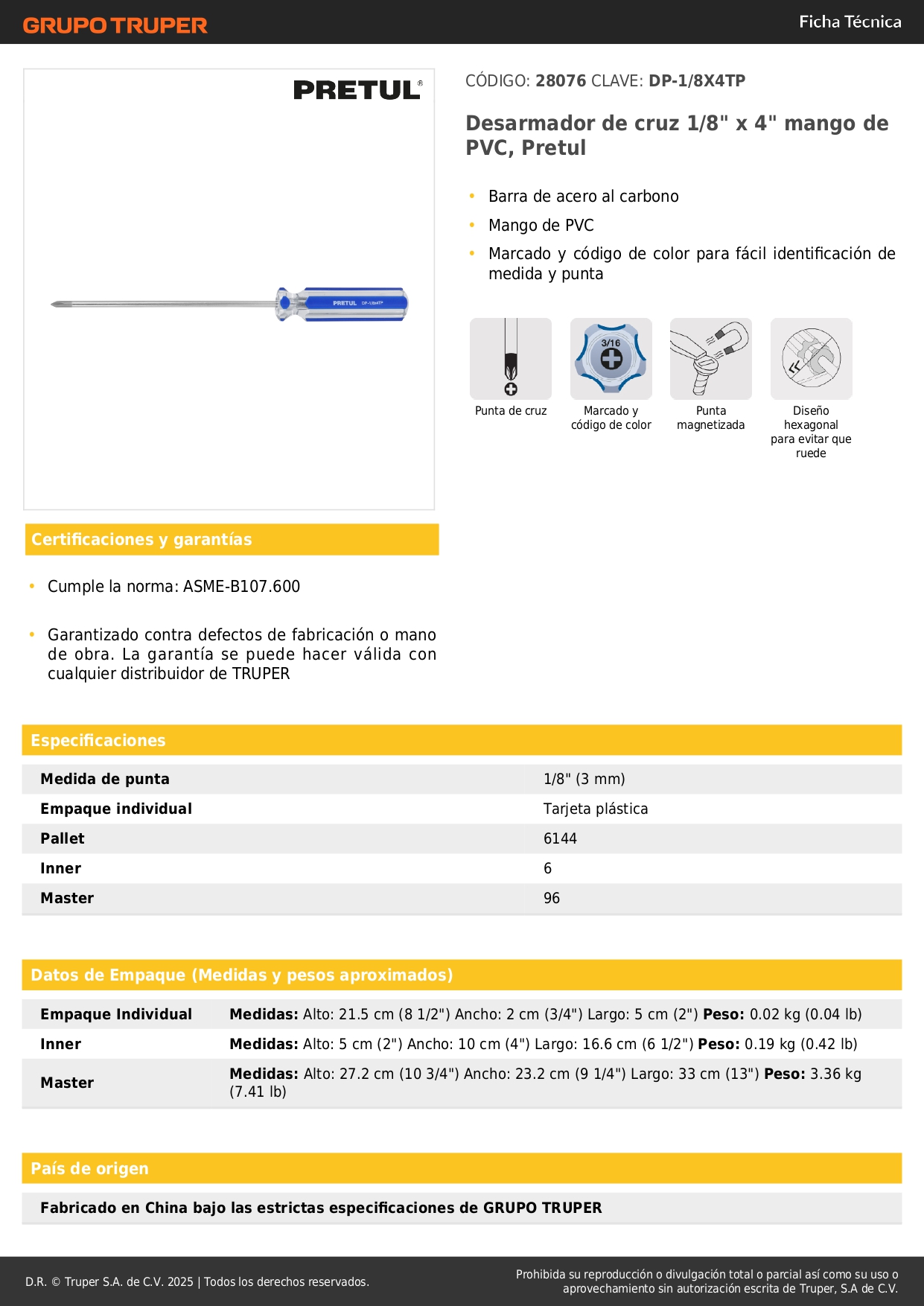 Desarmador de cruz 1/8'' x 4'' mango de pvc pretul S/ 4.00 Agregar al carro Avísame cuando llegue -Barra de acero al carbono-Mango de PVC-Marcado y código de color para fácil identificación de medida y punta