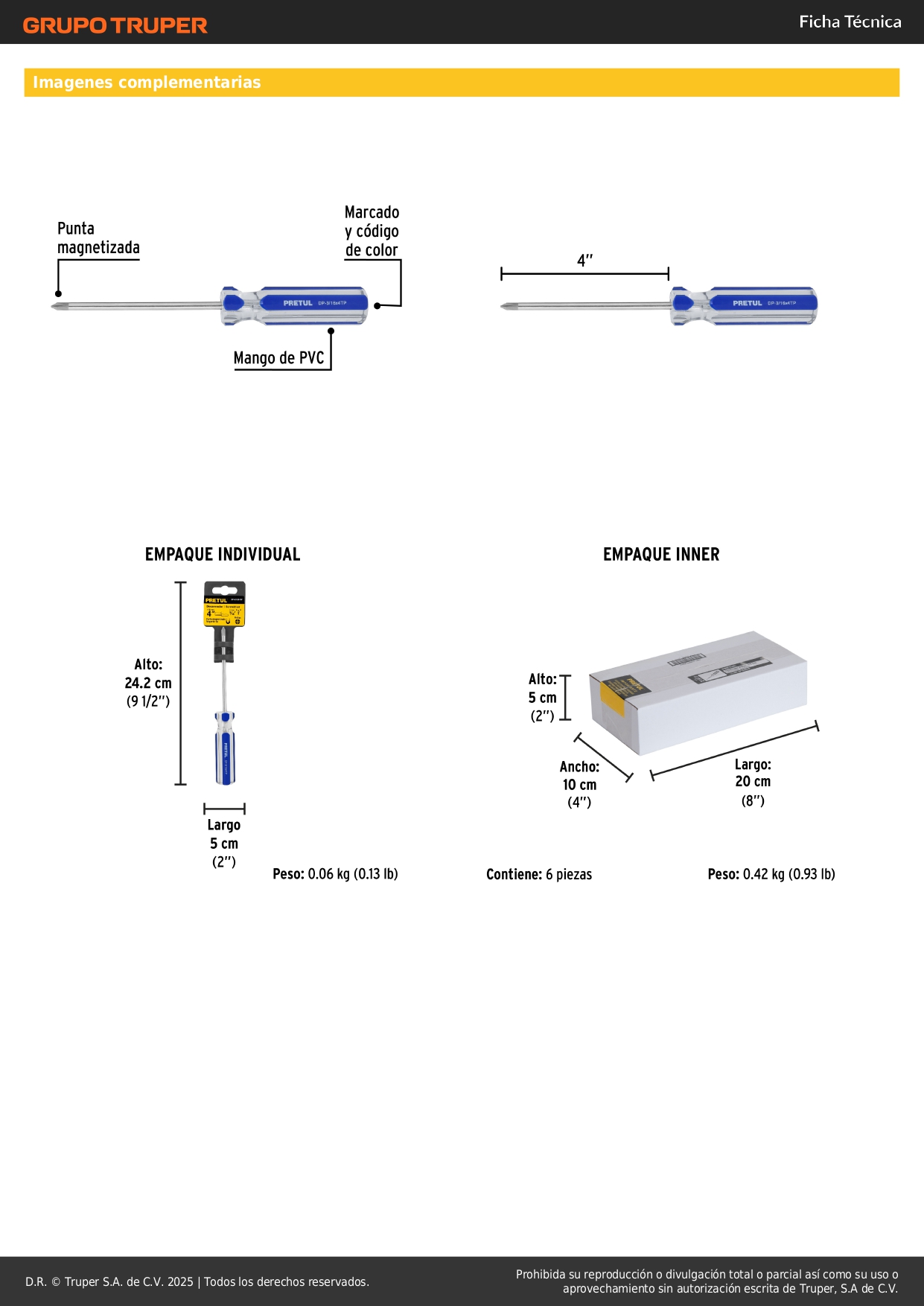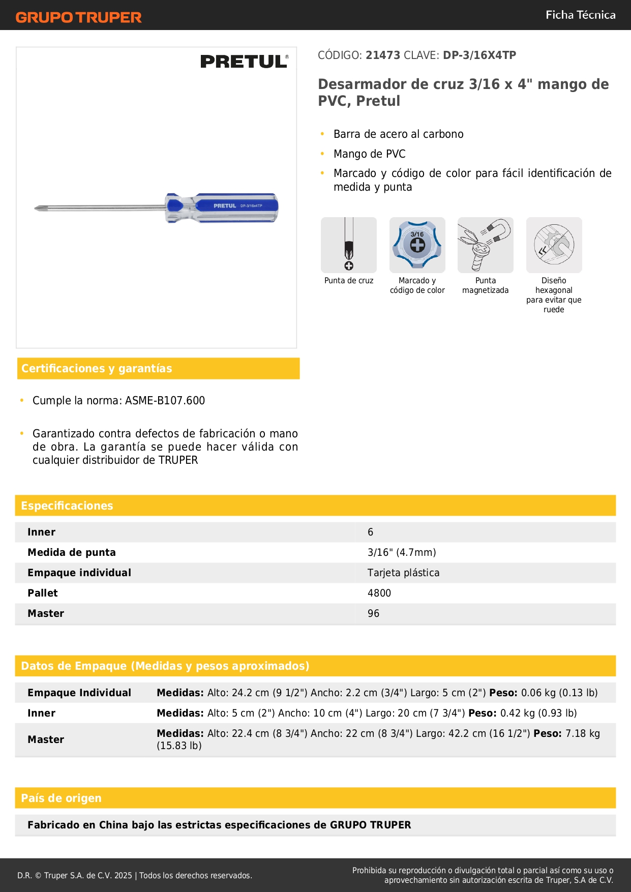 Desarmador de cruz 3/16 x 4´´ mango de pvc, pretul S/ 4.50 Agregar al carro Avísame cuando llegue -Barra de acero al carbono-Mango de PVC-Marcado y código de color para fácil identificación de medida y punta