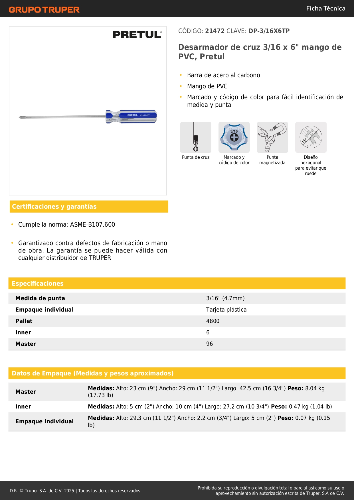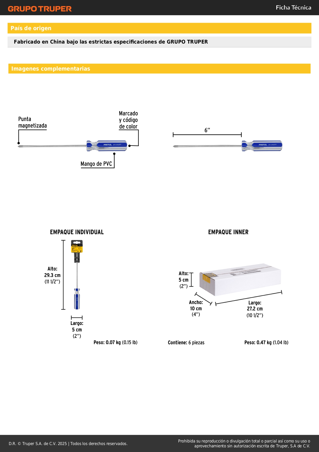 Desarmador de cruz 3/16 x 6´´ mango de pvc, pretul S/ 4.80 Agregar al carro Avísame cuando llegue -Barra de acero al carbono-Mango de PVC-Marcado y código de color para fácil identificación de medida y punta