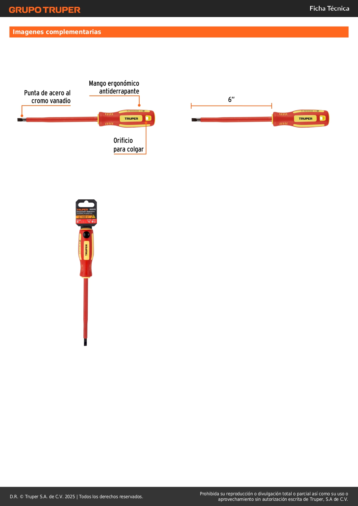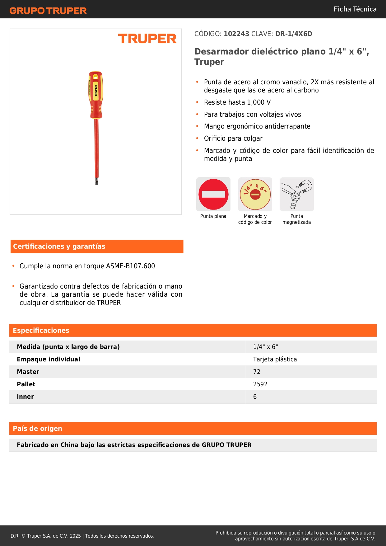 Desarmador dieléctrico plano 1/4' x 6', truper
