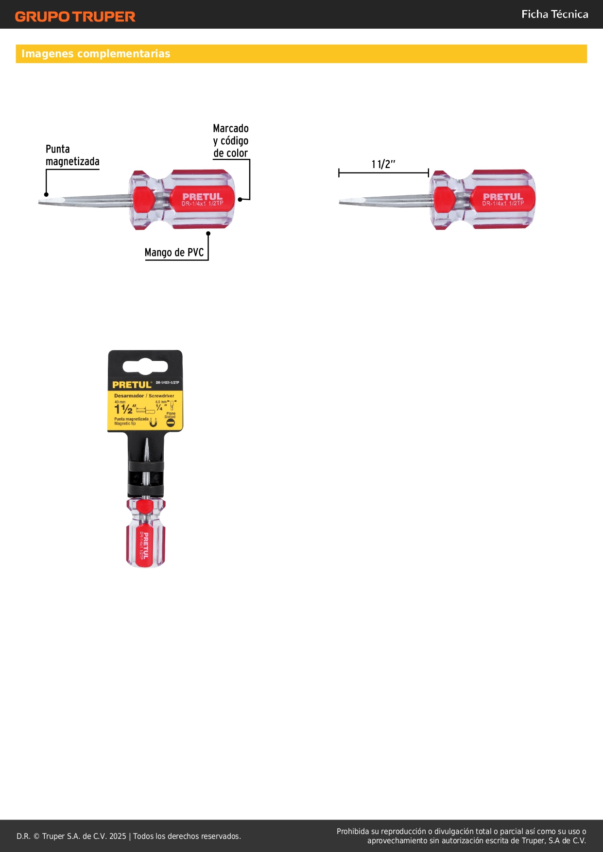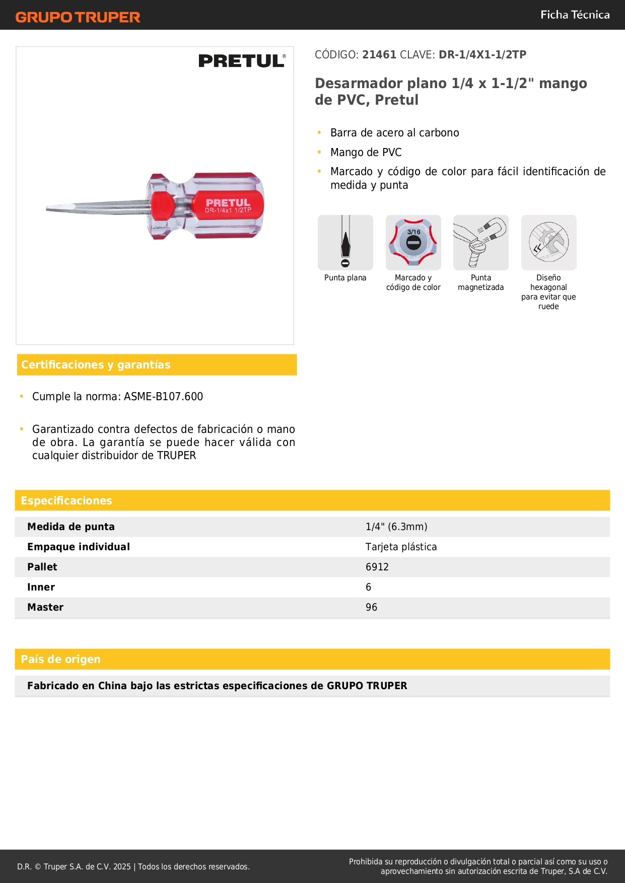 Desarmador plano 1/4 x 1-1/2´´ mango de pvc, pretul S/ 3.60 Agregar al carro Avísame cuando llegue -Barra de acero al carbono-Mango de PVC-Marcado y código de color para fácil identificación de medida y punta