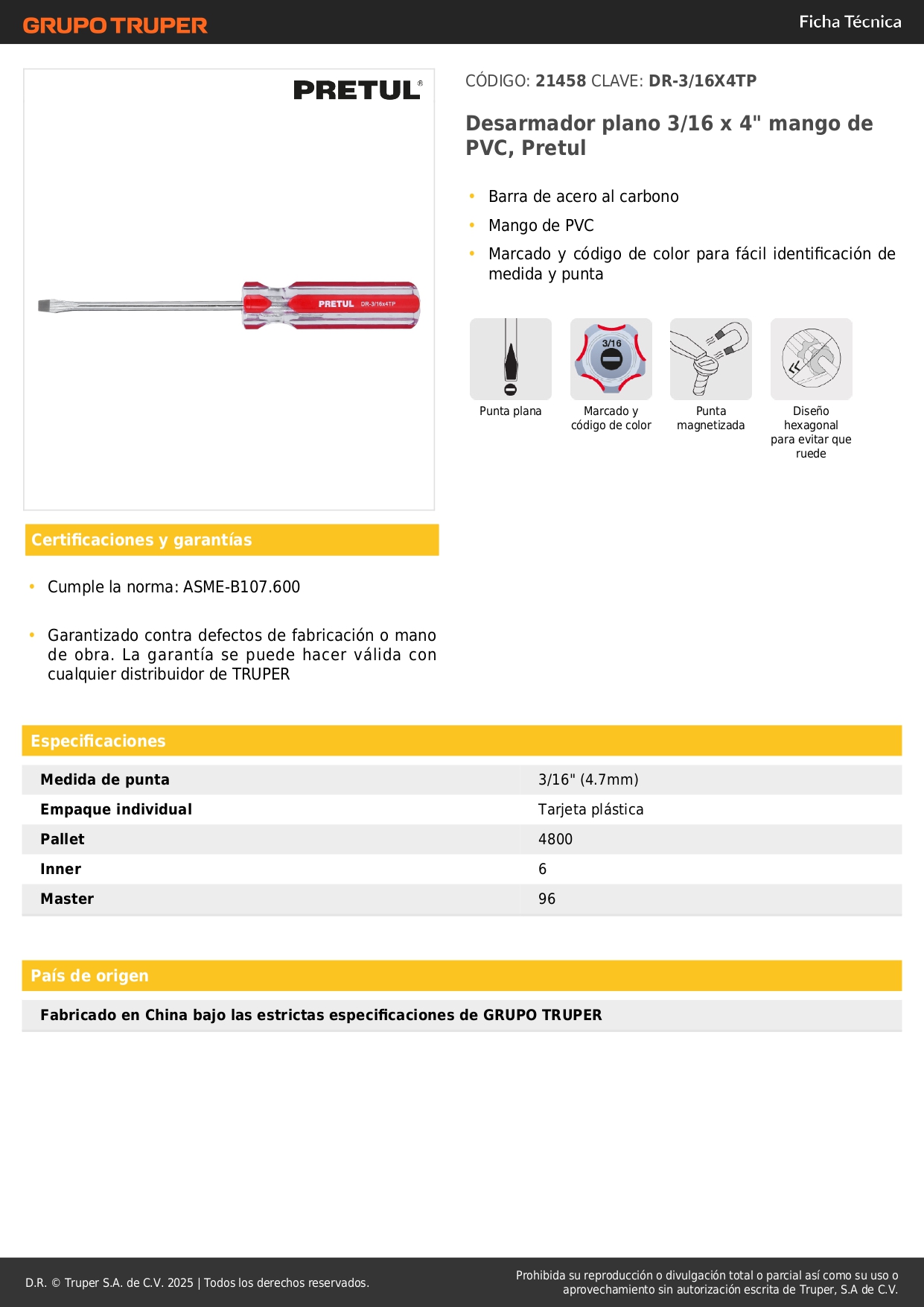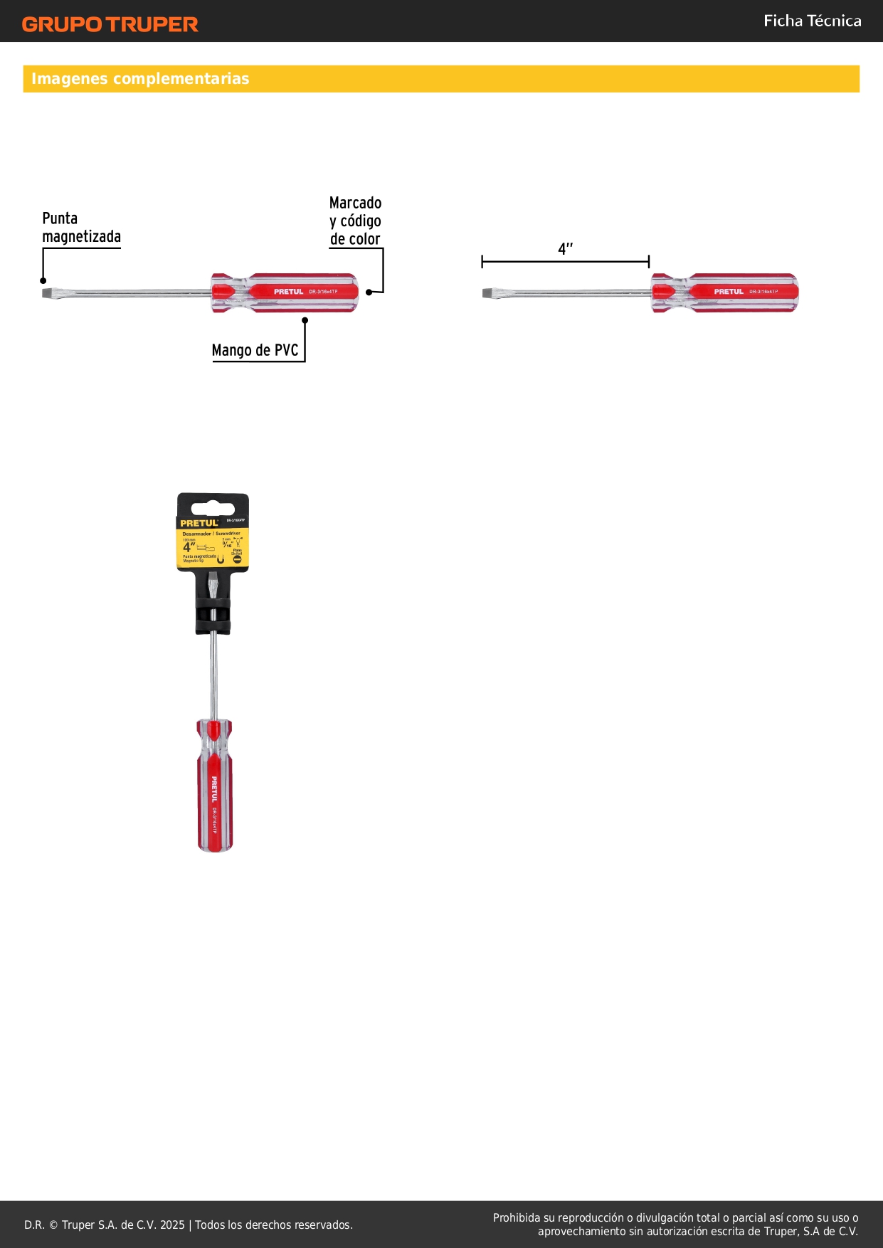 Desarmador plano 3/16 x 4´´ mango de pvc, pretul S/ 4.50 Agregar al carro Avísame cuando llegue -Barra de acero al carbono-Mango de PVC-Marcado y código de color para fácil identificación de medida y punta
