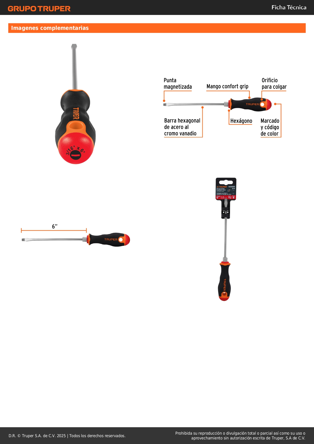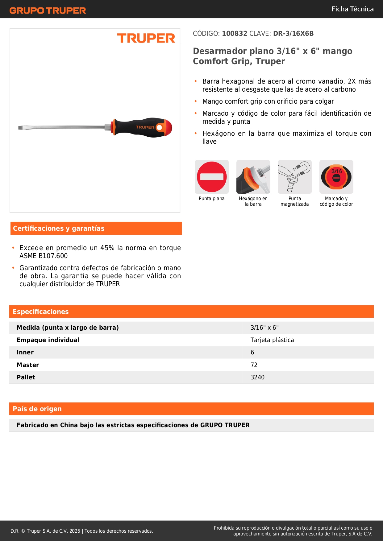 Desarmador plano 3/16´´ x 6´´ mango comfort grip, truper