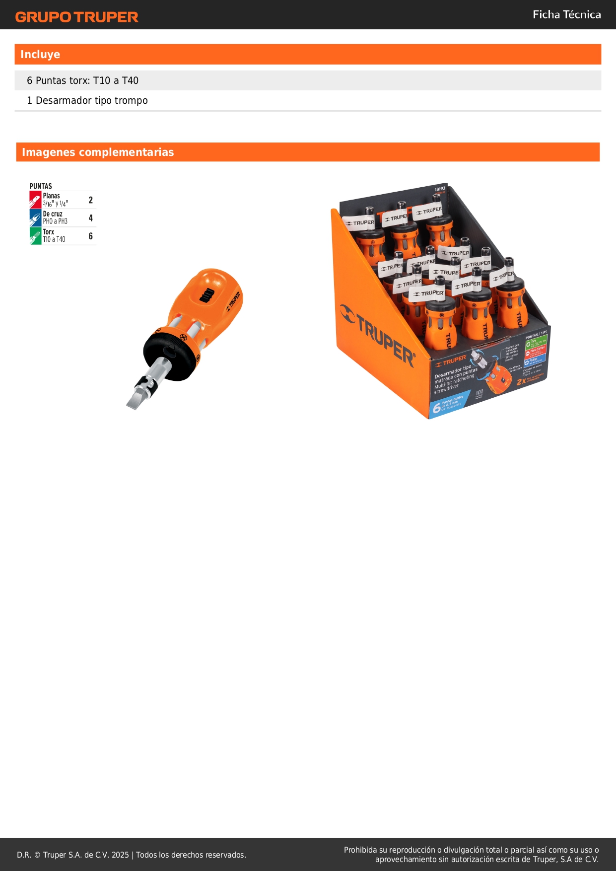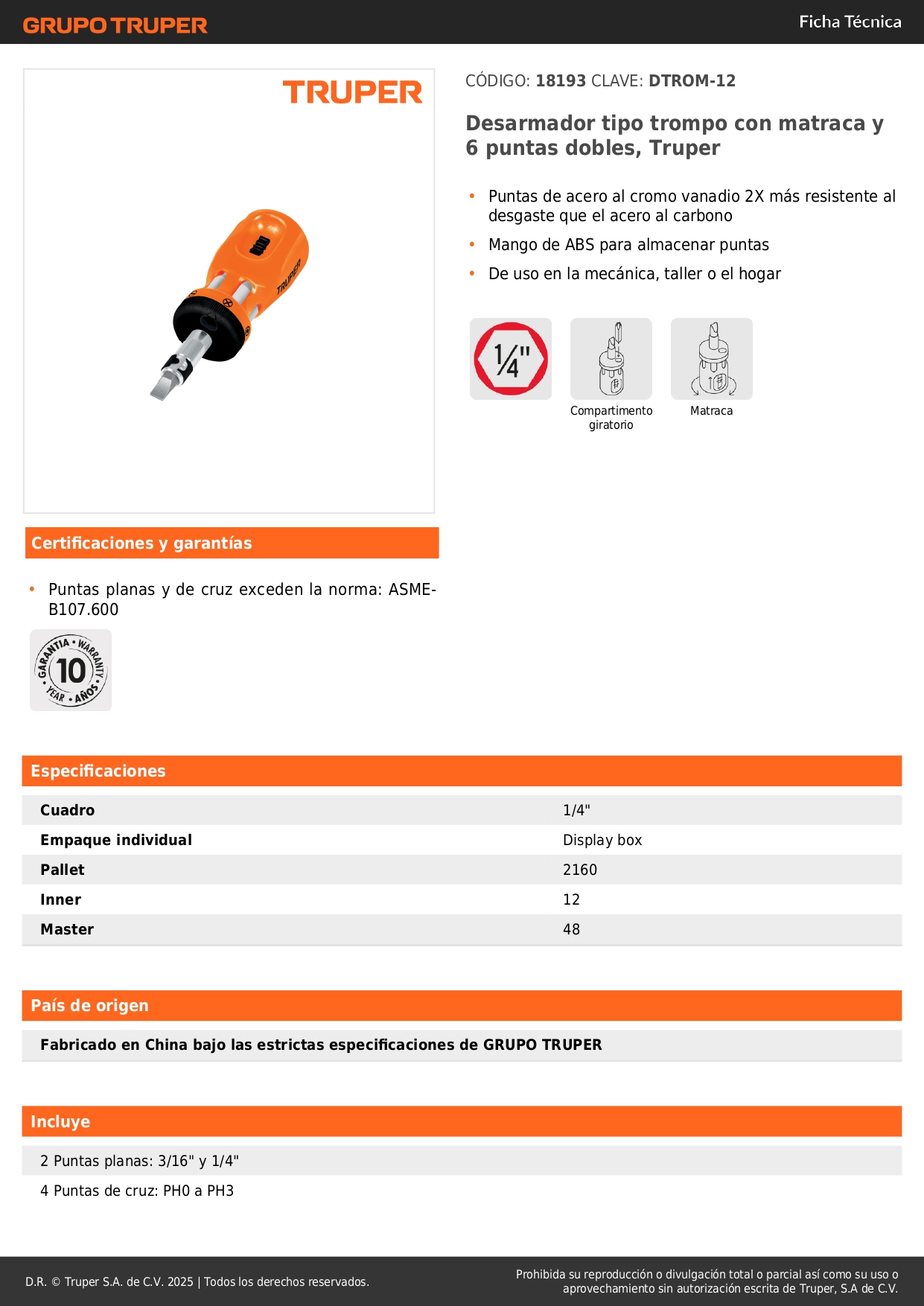 Desarmador tipo trompo con matraca y 6 puntas dobles truper S/ 15.90 Agregar al carro Avísame cuando llegue -Puntas de acero al cromo vanadio 2X más resistente al desgaste que el acero al carbono-Mango de ABS para almacenar puntas-De uso en la mecánica, taller o el hogar