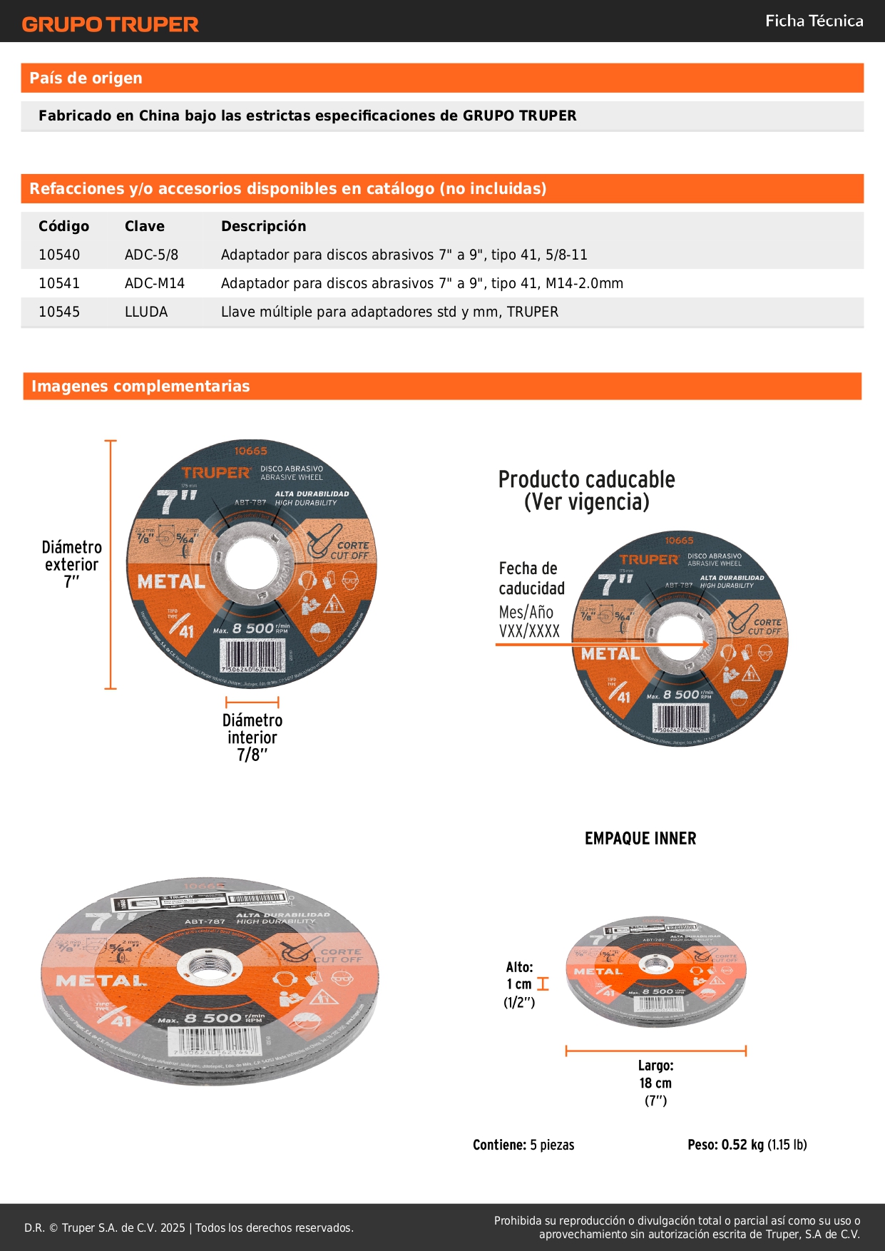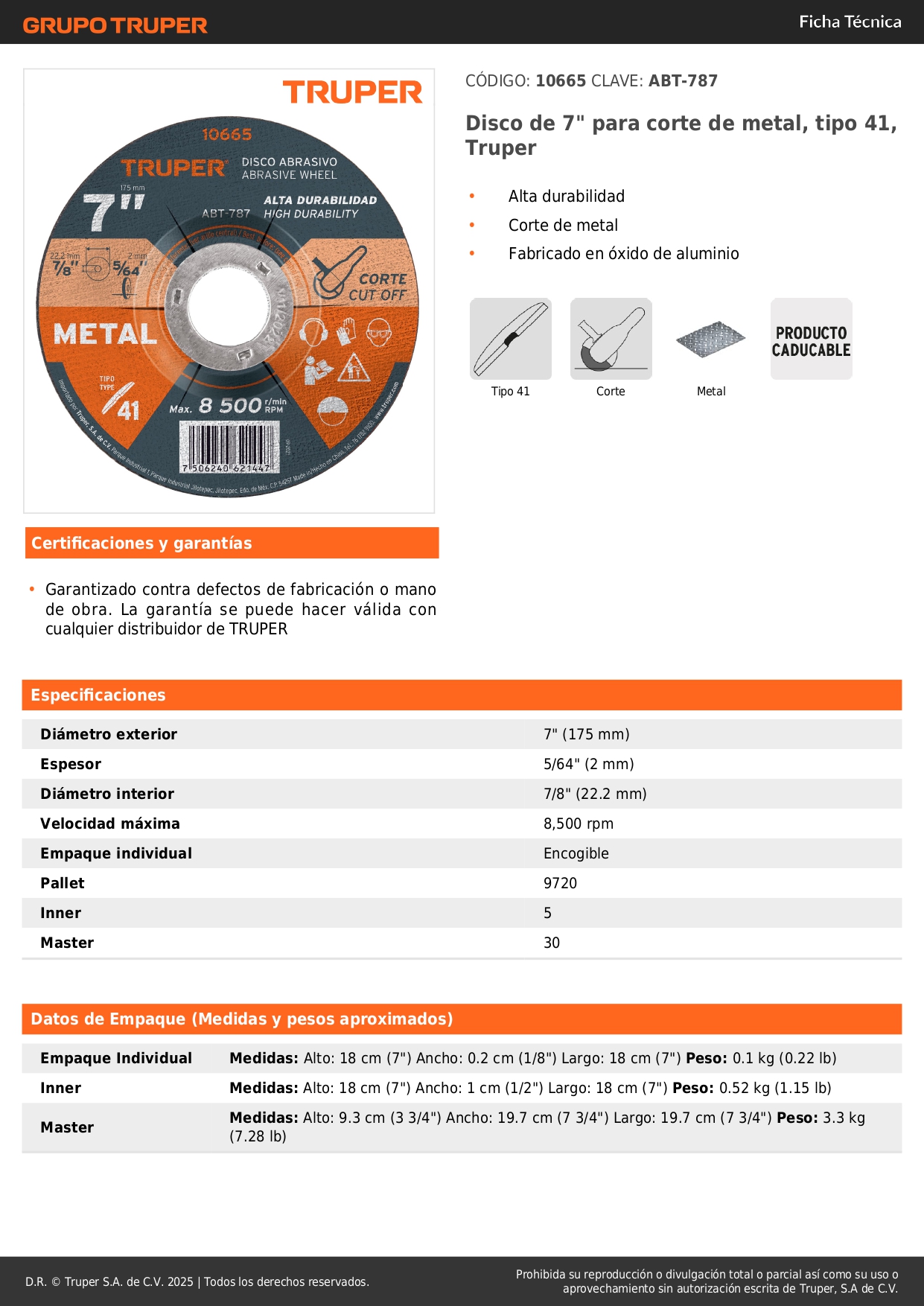 Disco de 7´´ para corte de metal, tipo 41, truper S/ 6.20 Agregar al carro Avísame cuando llegue -Alta durabilidad-Corte de metal-Fabricado en óxido de aluminio