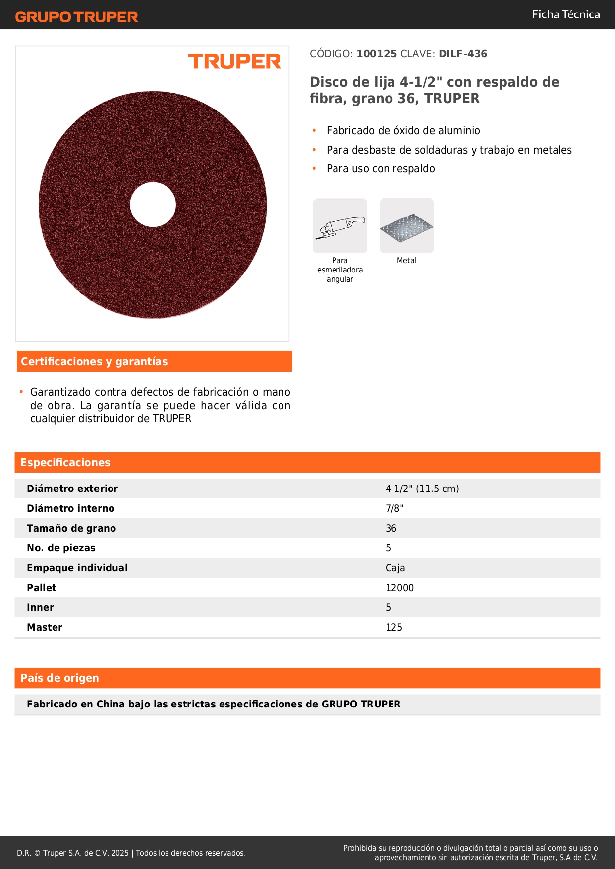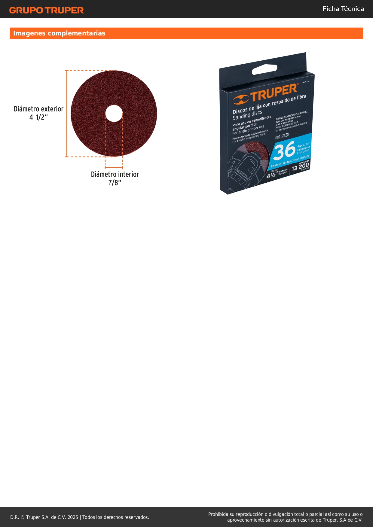Disco de lija 4-1/2´´ con respaldo de fibra, grano 36, truper S/ 2.50 Agregar al carro Avísame cuando llegue -Fabricado de óxido de aluminio-Para desbaste de soldaduras y trabajo en metales-Para uso con respaldo