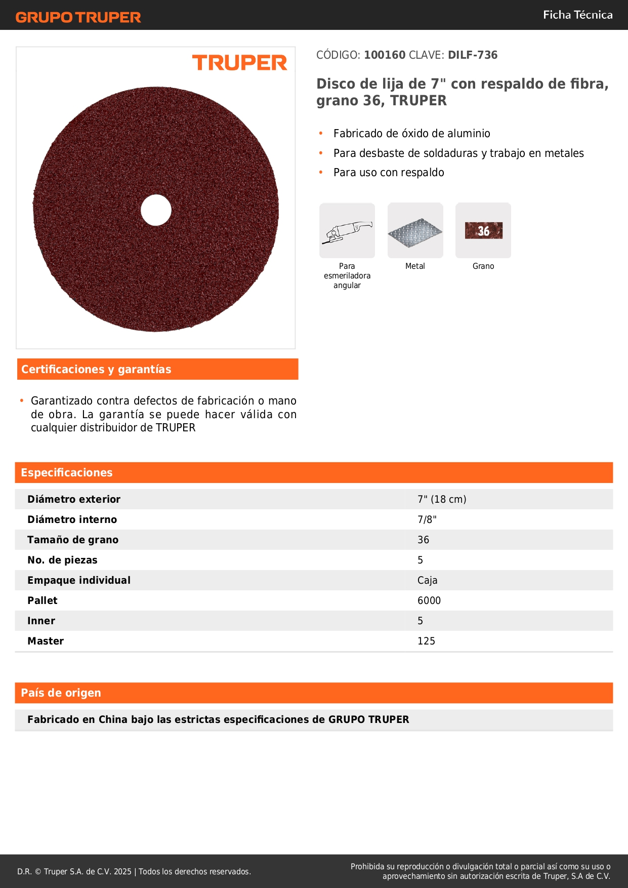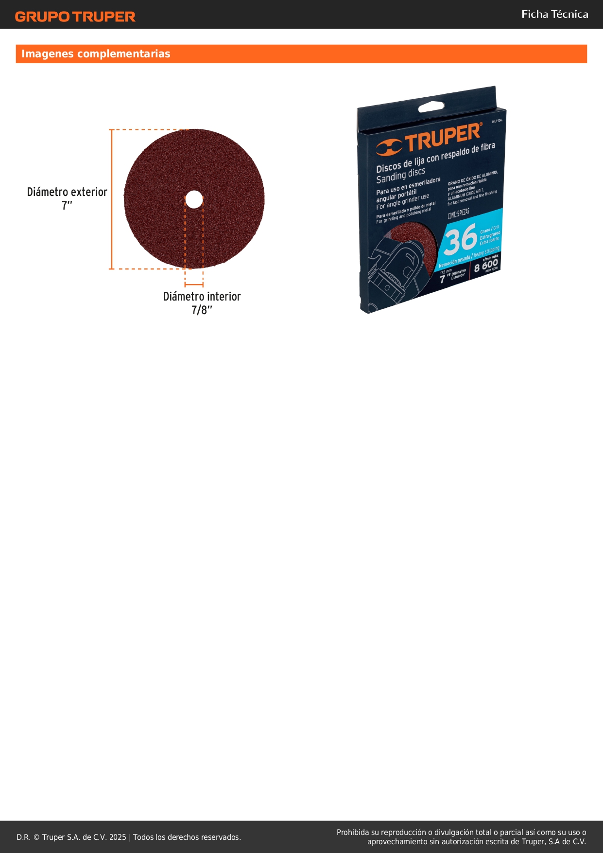 Disco de lija de 7´´ con respaldo de fibra, grano 36, truper S/ 4.40 Agregar al carro Avísame cuando llegue -Fabricado de óxido de aluminio-Para desbaste de soldaduras y trabajo en metales-Para uso con respaldo