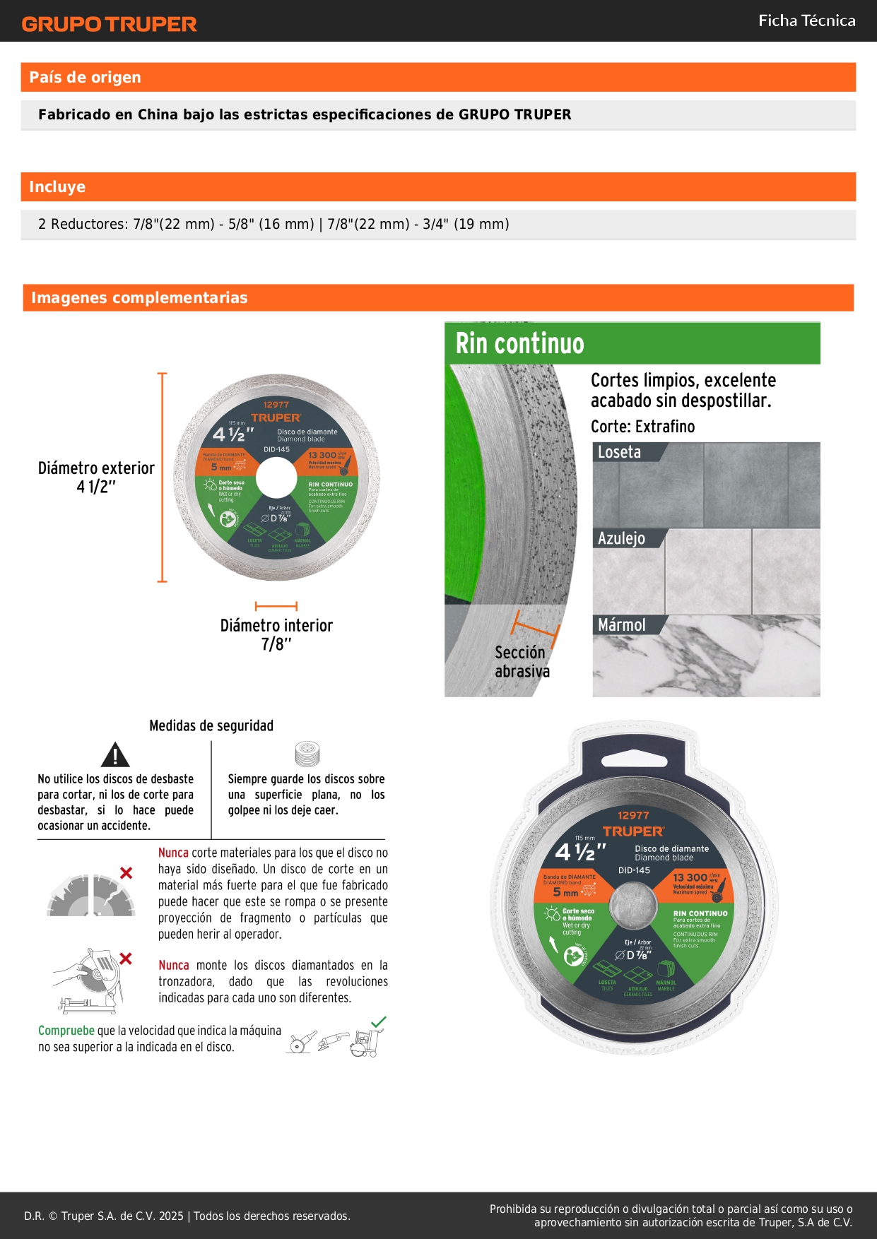 Disco diamantado de 4-1/2'' x 1.6 mm rin continuo. truper S/ 21.20 Agregar al carro Avísame cuando llegue -Rin continuo, para cortes limpios, excelente acabado sin despostillar-Corte en seco o húmedo-Para corte extrafino en loseta, azulejo y mármol