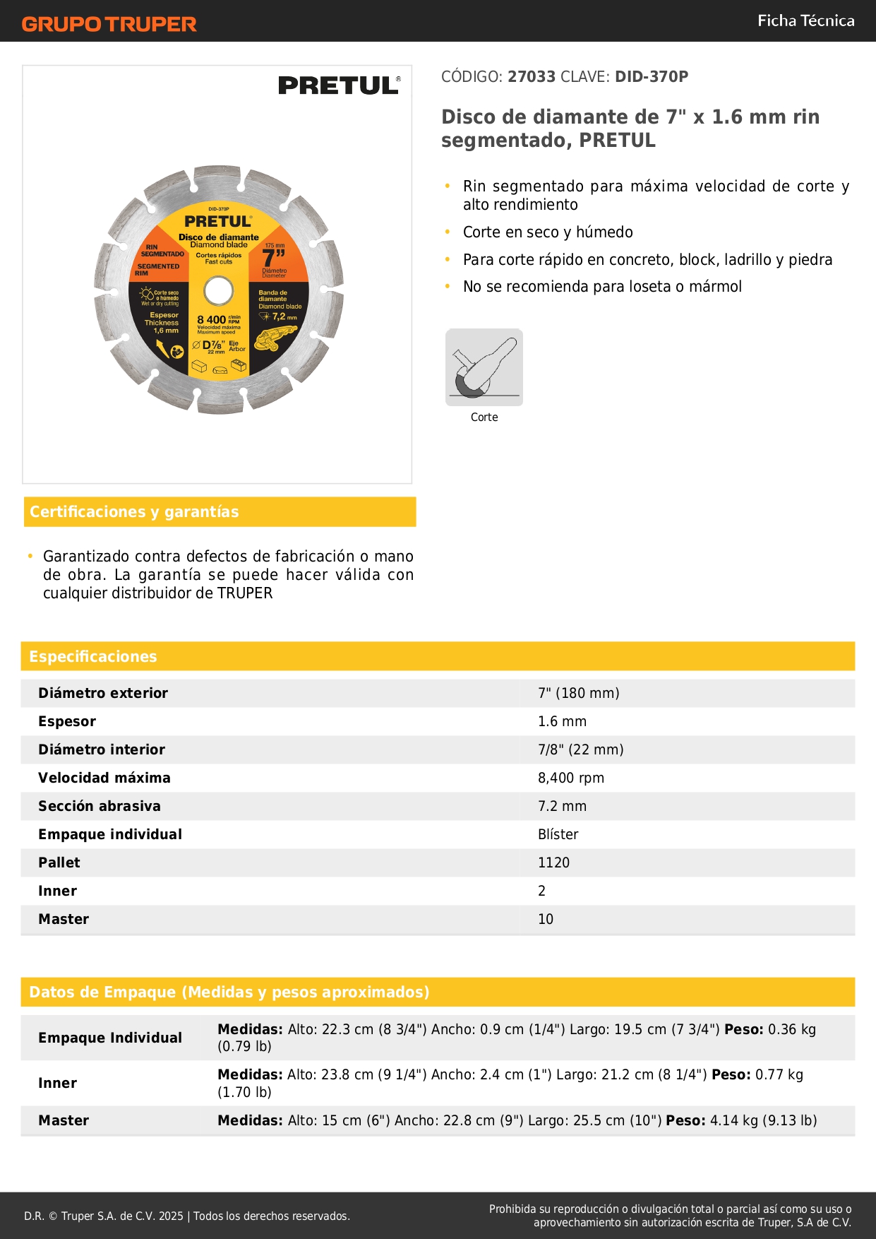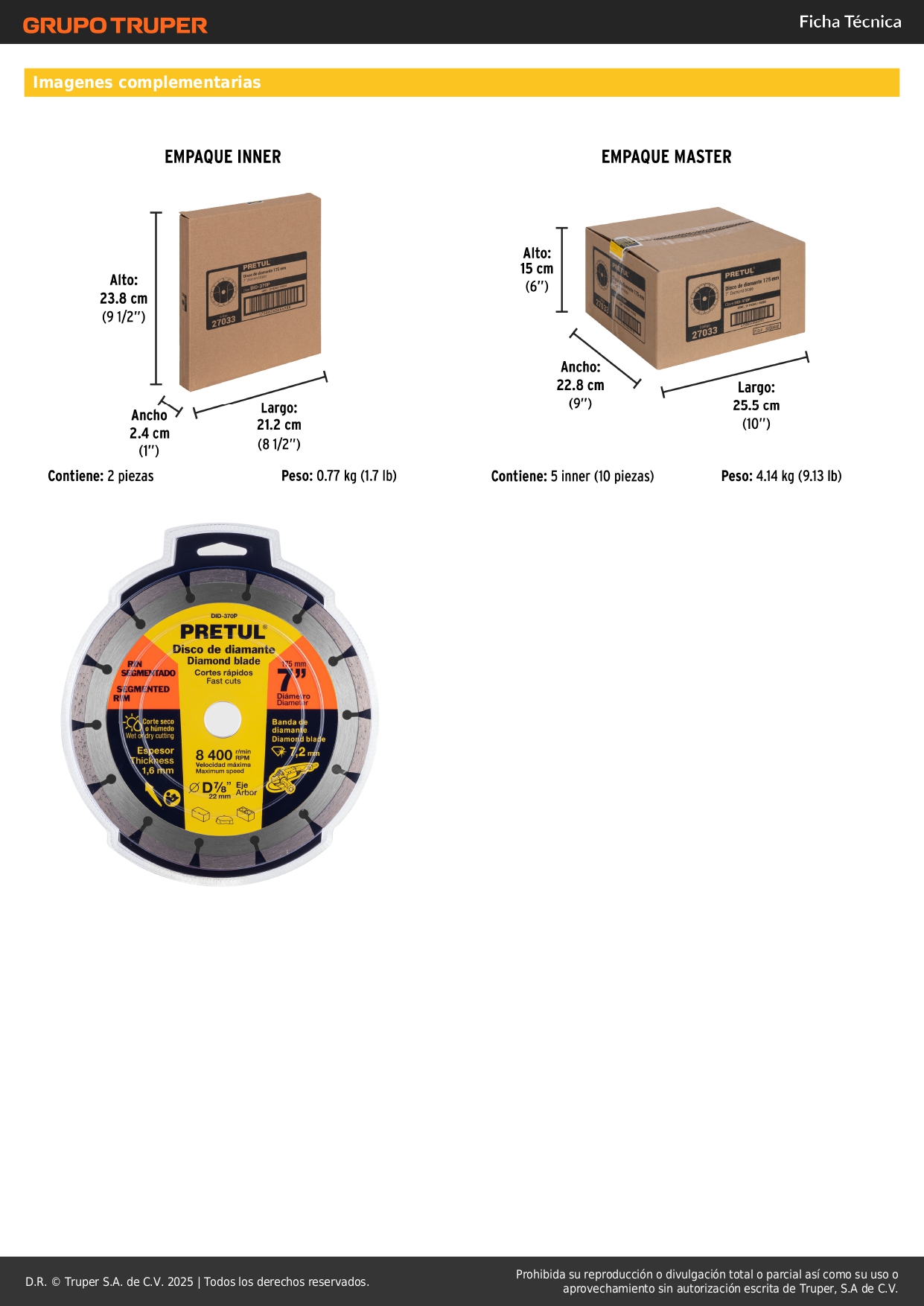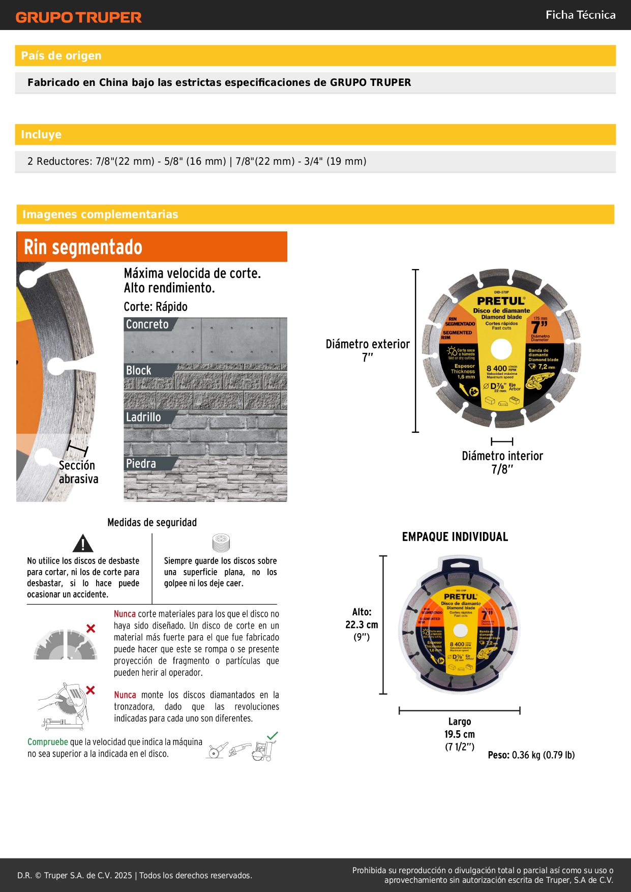 Disco diamantado de 7´´ x 1.6 mm rin segmentado, pretul S/ 31.20 Agregar al carro Avísame cuando llegue -Rin segmentado para máxima velocidad de corte y alto rendimiento-Corte en seco y húmedo-Para corte rápido en concreto, block, ladrillo y piedra-No se recomienda para loseta o mármol