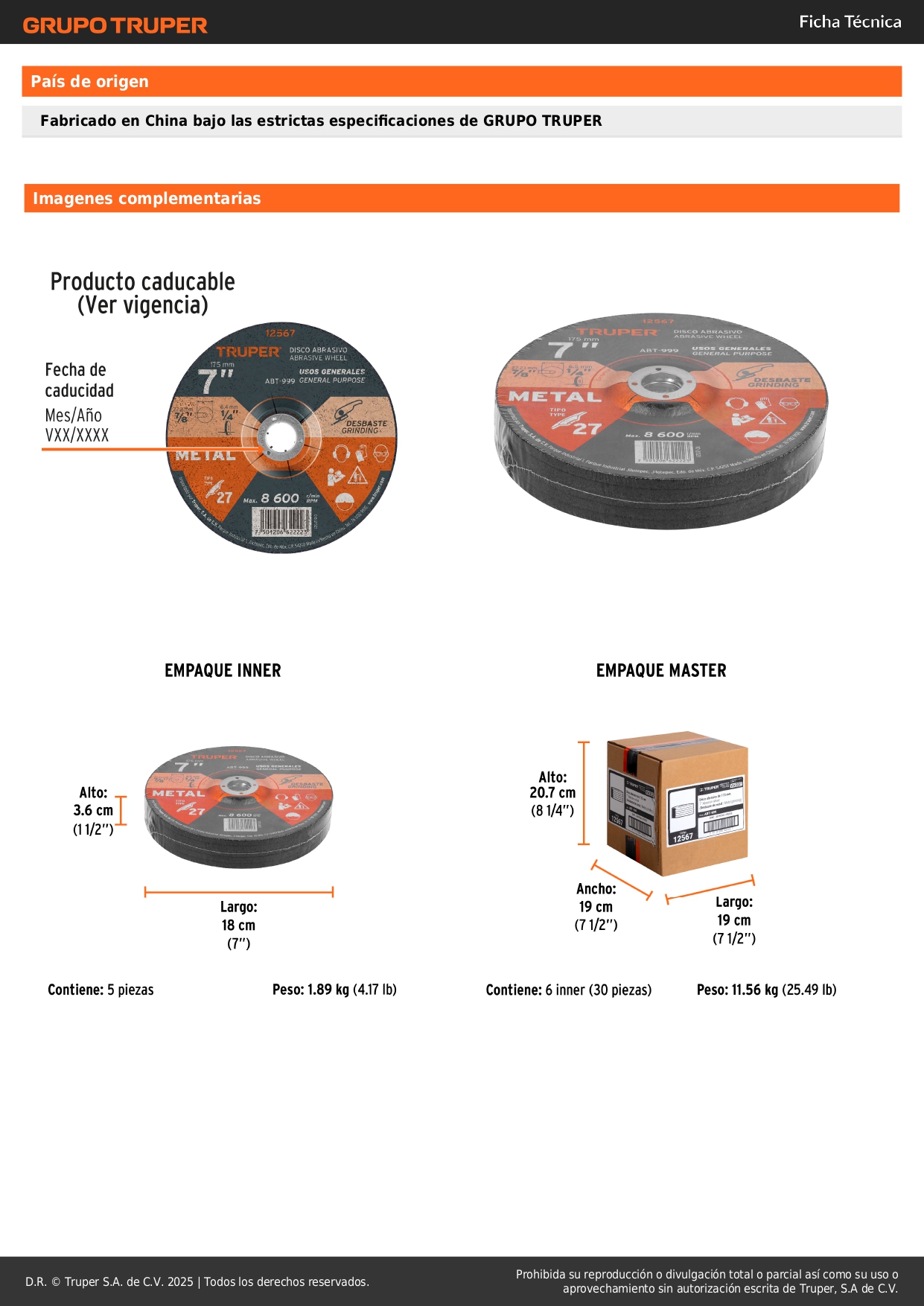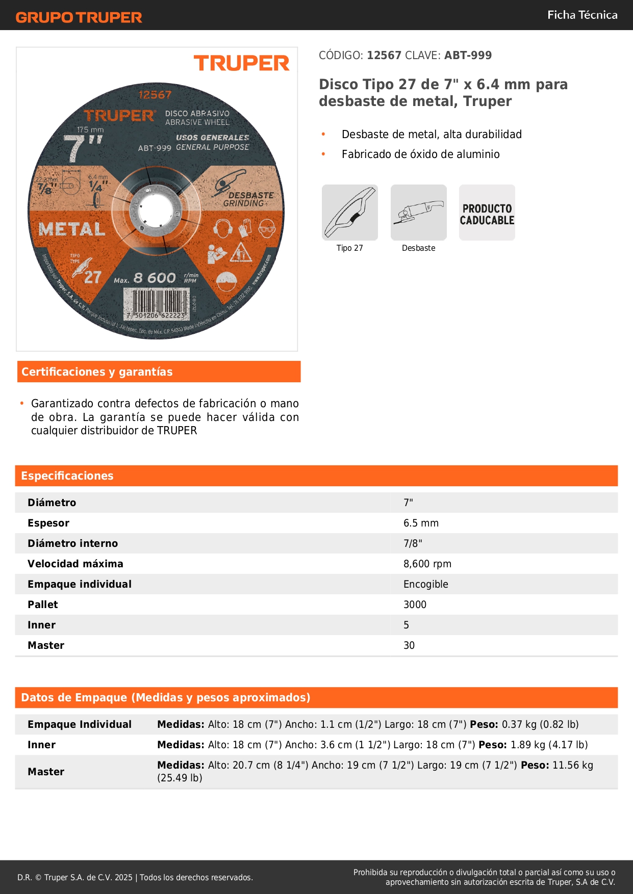 Disco tipo 27 de 7'' x 6.4 mm para desbaste de metal truper S/ 11.00 Agregar al carro Avísame cuando llegue -Desbaste de metal, alta durabilidad-Fabricado de óxido de aluminio