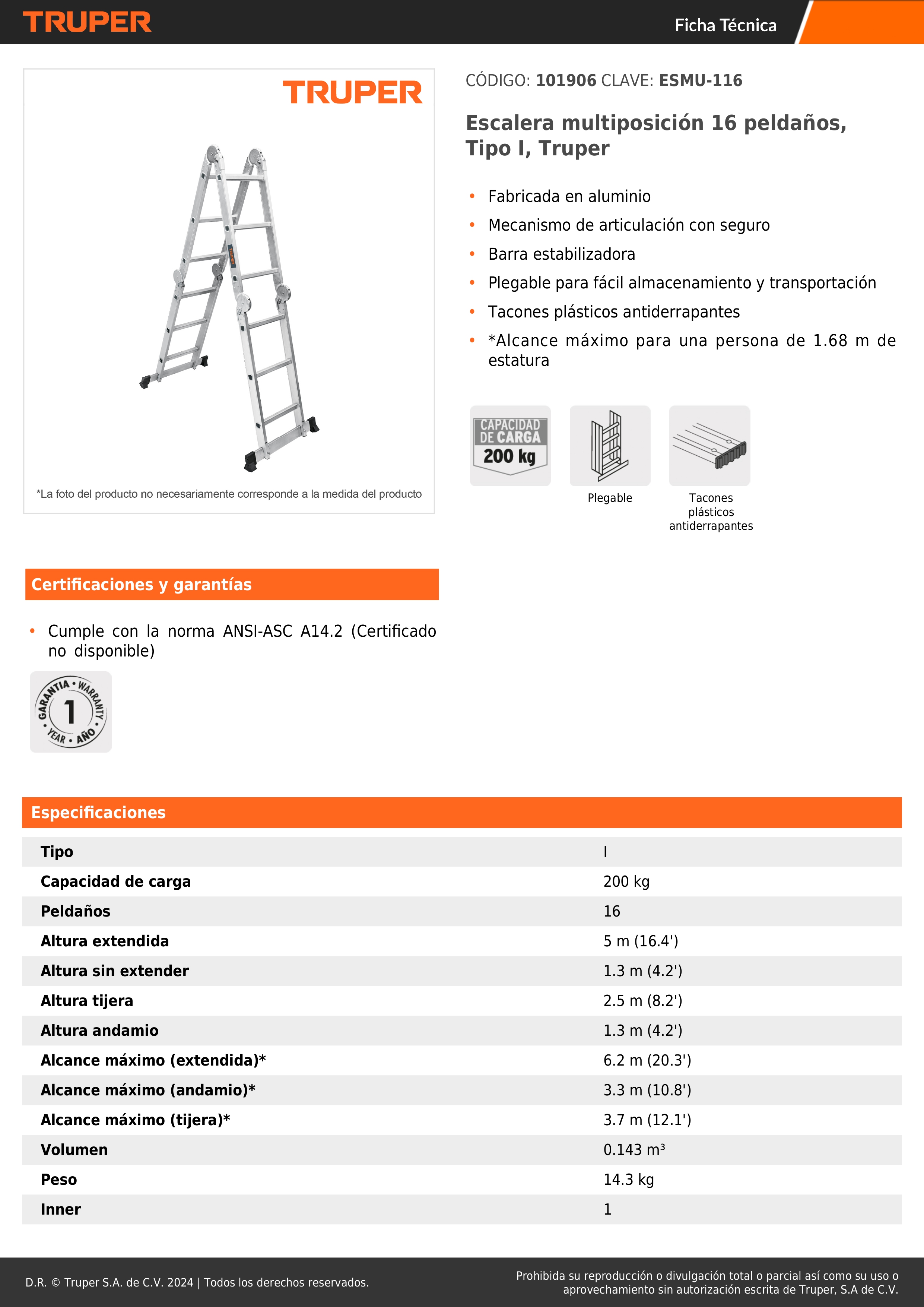 Escalera Multiposicion 16 peldaños, Tipo I - Truper