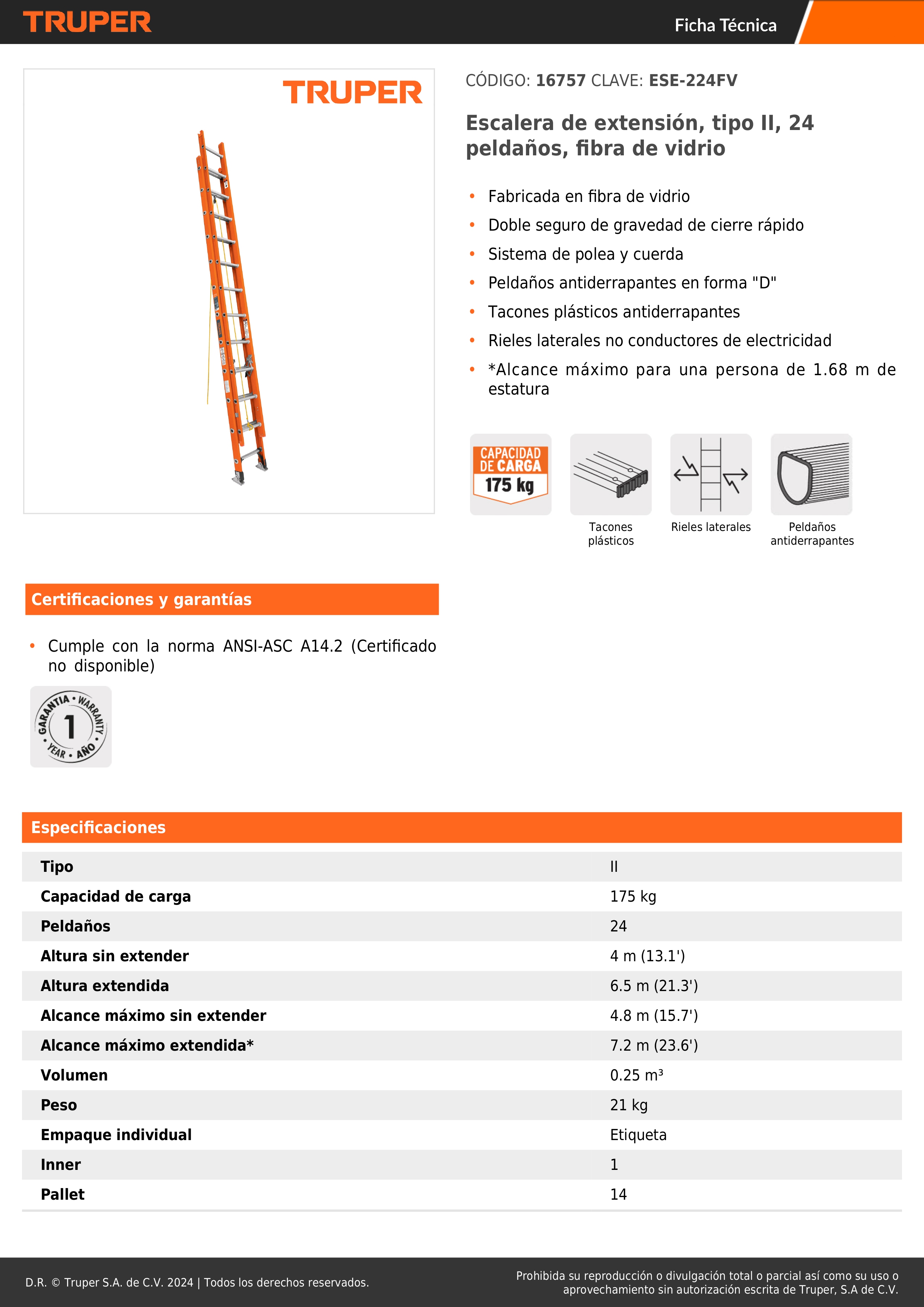 Escalera de extensión, tipo II, 24 peldaños, fibra de vidrio