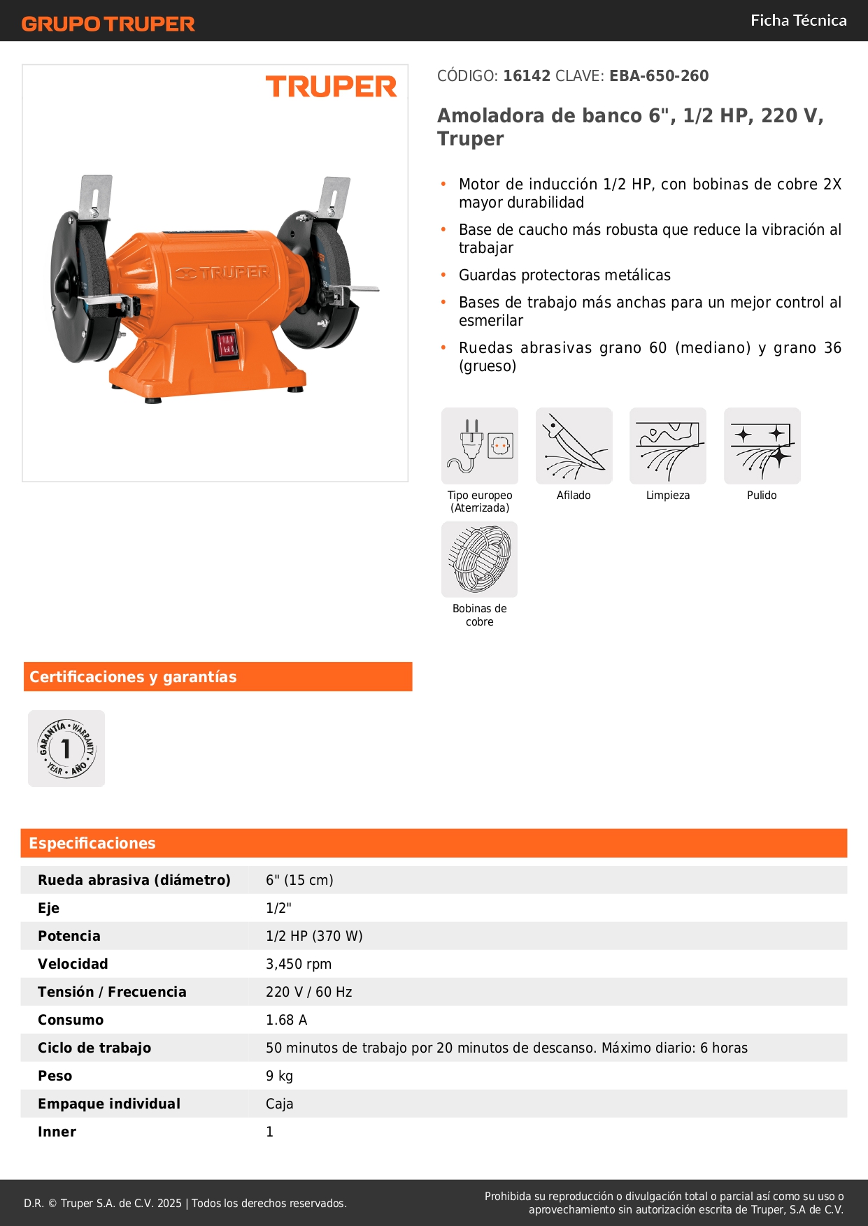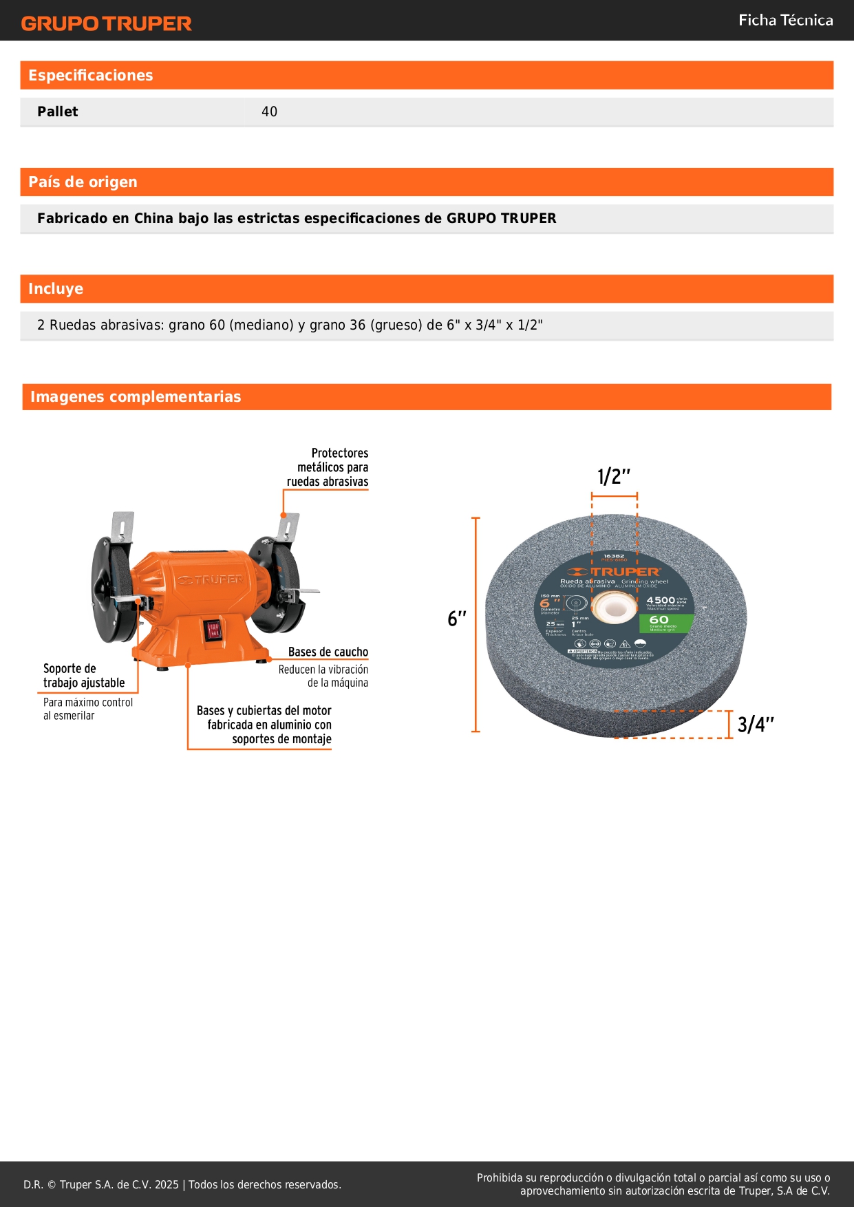 Amoladora de banco 6", 1/2 HP, 220 V, Truper