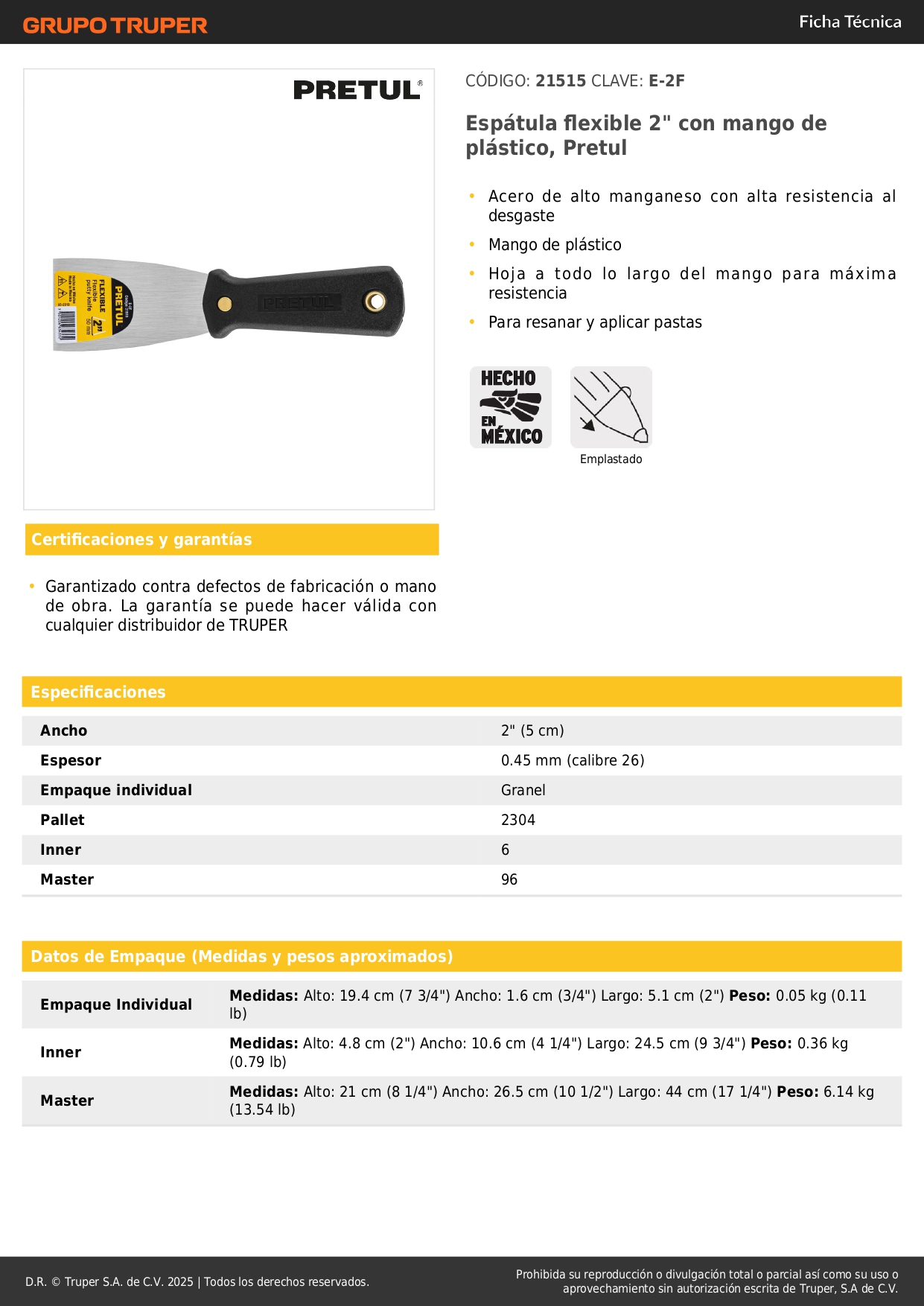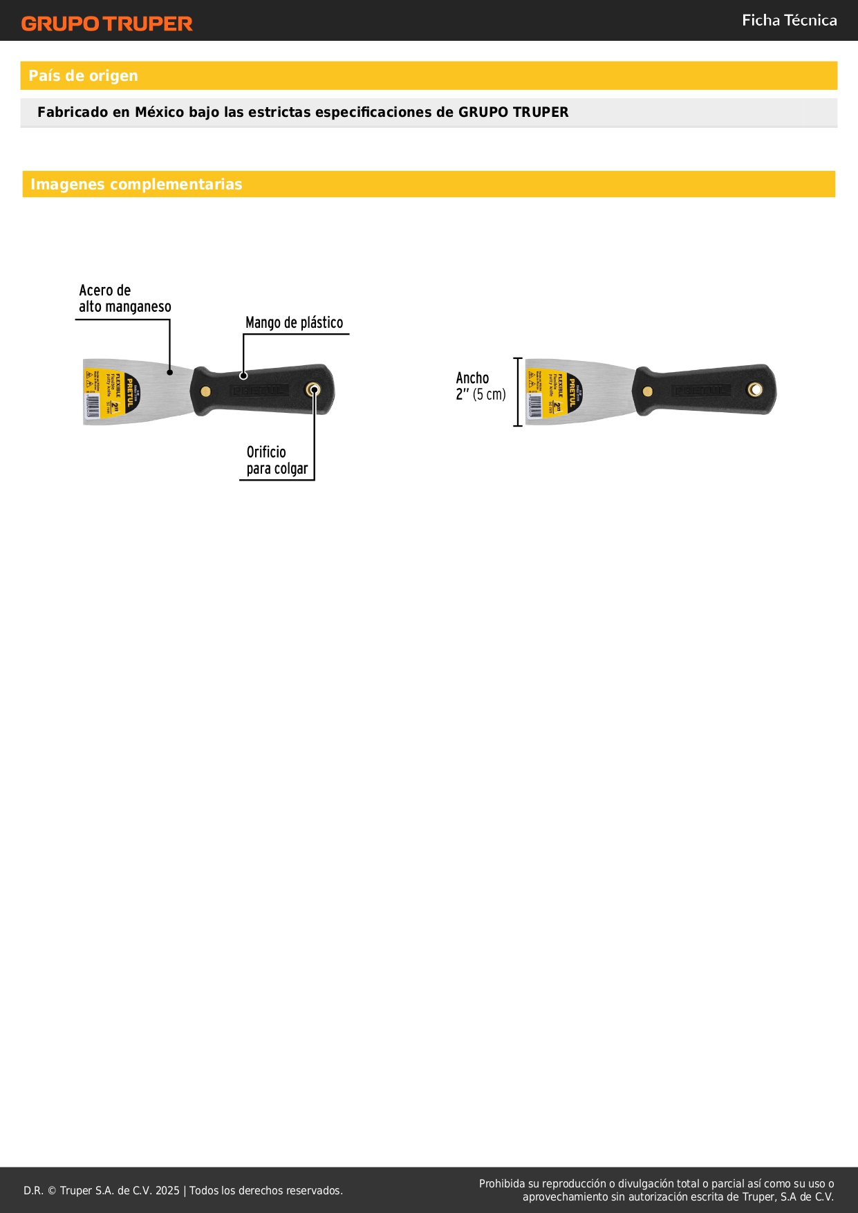 Espátula flexible 2'' con mango de plástico. pretul S/ 3.90 Agregar al carro Avísame cuando llegue -Acero de alto manganeso con alta resistencia al desgaste-Mango de plástico-Hoja a todo lo largo del mango para máxima resistencia-Para resanar y aplicar pastas