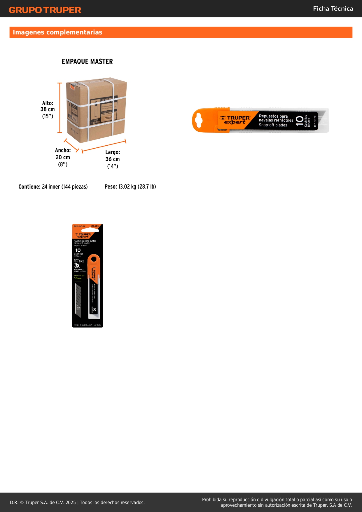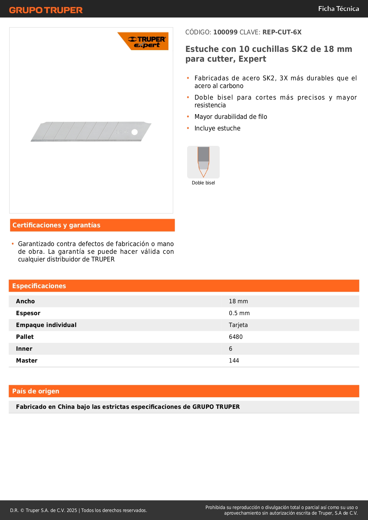 Estuche con 10 navajas sk2 de 18 mm para cuchilla, expert truper S/ 7.00 Agregar al carro Avísame cuando llegue -Fabricadas de acero SK2, 3X más durables que el acero al carbono-Doble bisel para cortes más precisos y mayor resistencia-Mayor durabilidad de filo-Incluye estuche