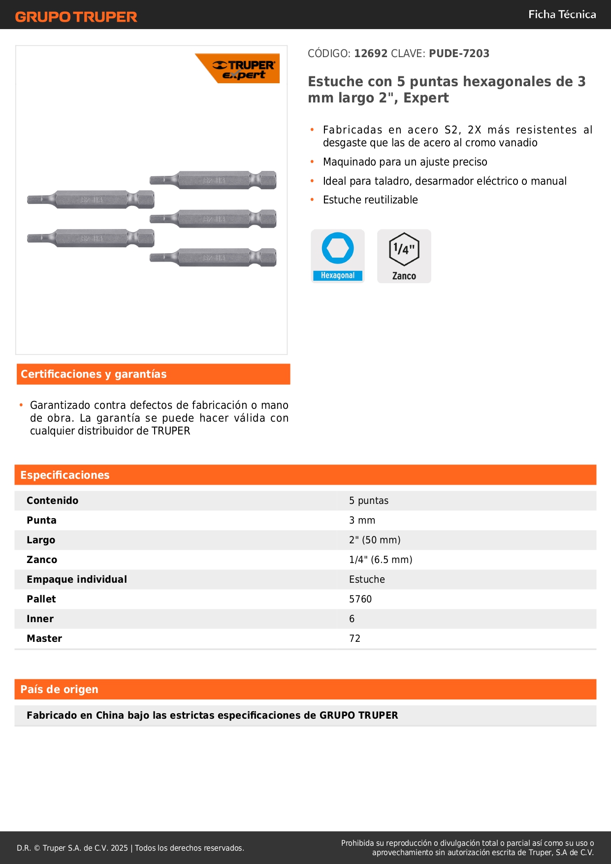 Estuche con 5 puntas hexagonales de 3 mm largo 2´´, expert truper