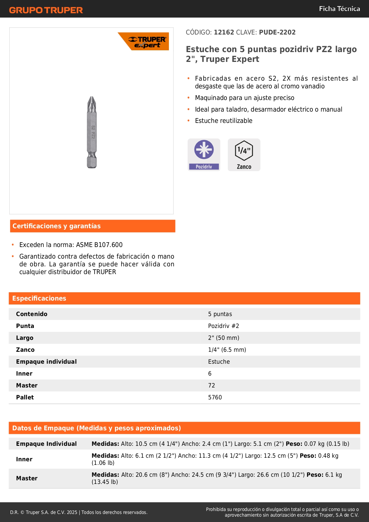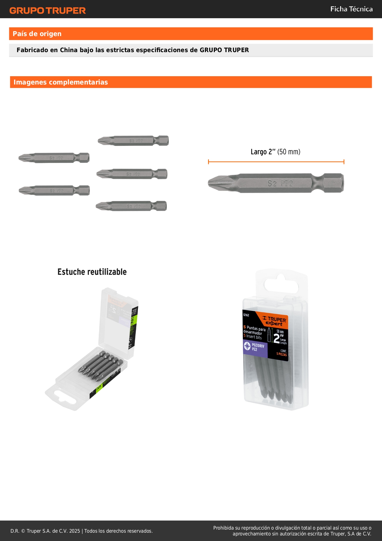Estuche con 5 puntas pozidriv pz2 largo 2´´, truper expert