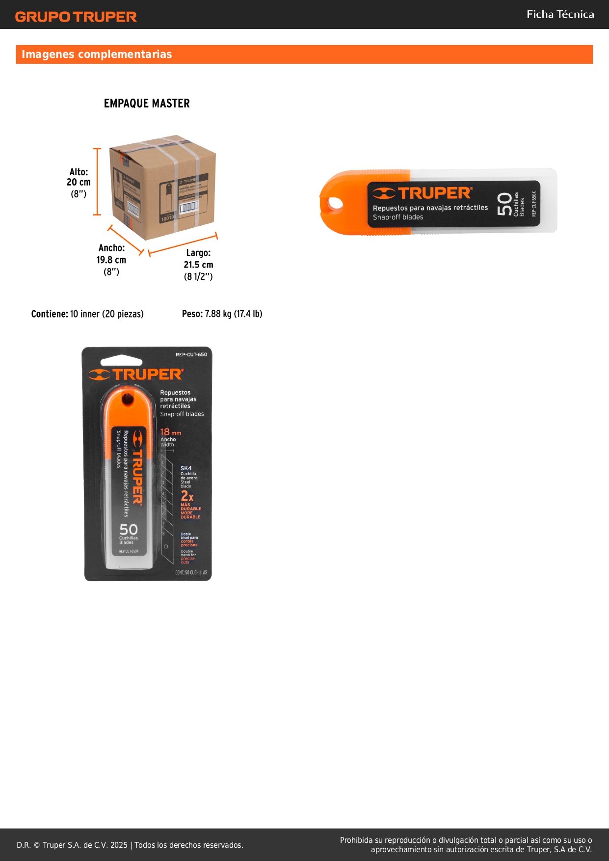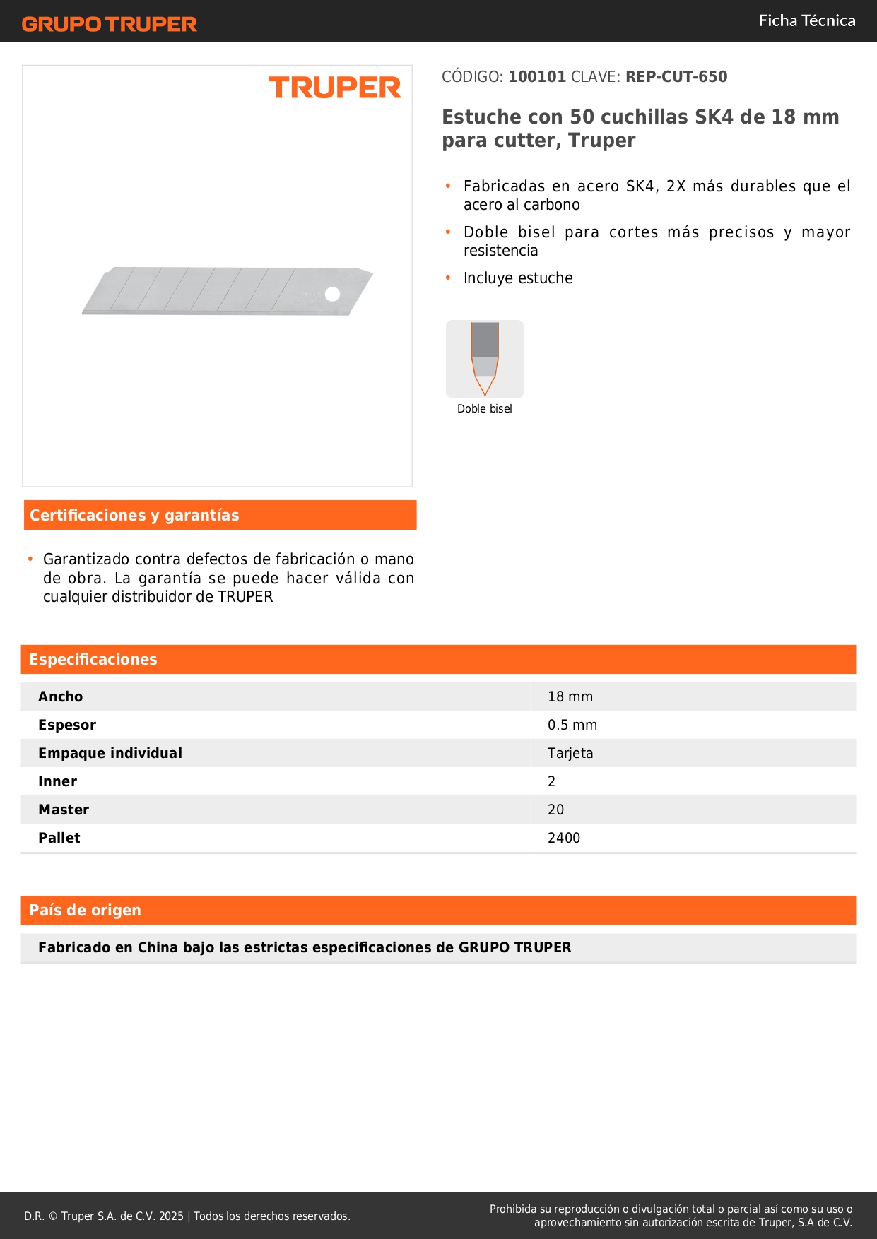 Estuche con 50 navajas sk4 de 18 mm para cuchilla, truper S/ 15.30 Agregar al carro Avísame cuando llegue -Fabricadas en acero SK4, 2X más durables que el acero al carbono-Doble bisel para cortes más precisos y mayor resistencia-Incluye estuche