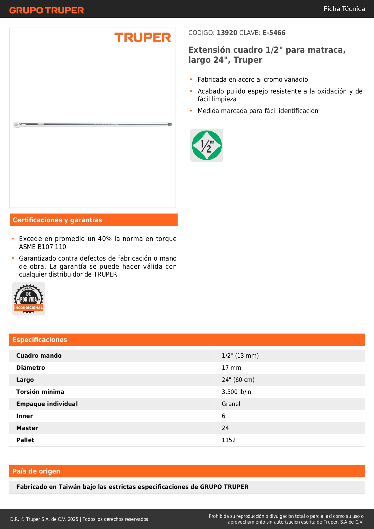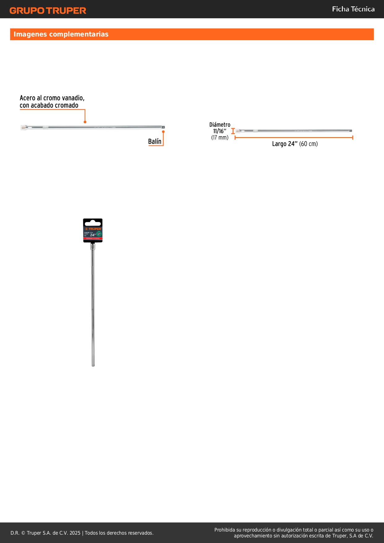 Extensión de 24'' para ratchet para dados encastre 1/2'' truper S/ 67.50 Agregar al carro Avísame cuando llegue -Fabricada en acero al cromo vanadio-Acabado pulido espejo resistente a la oxidación y de fácil limpieza-Medida marcada para fácil identificación