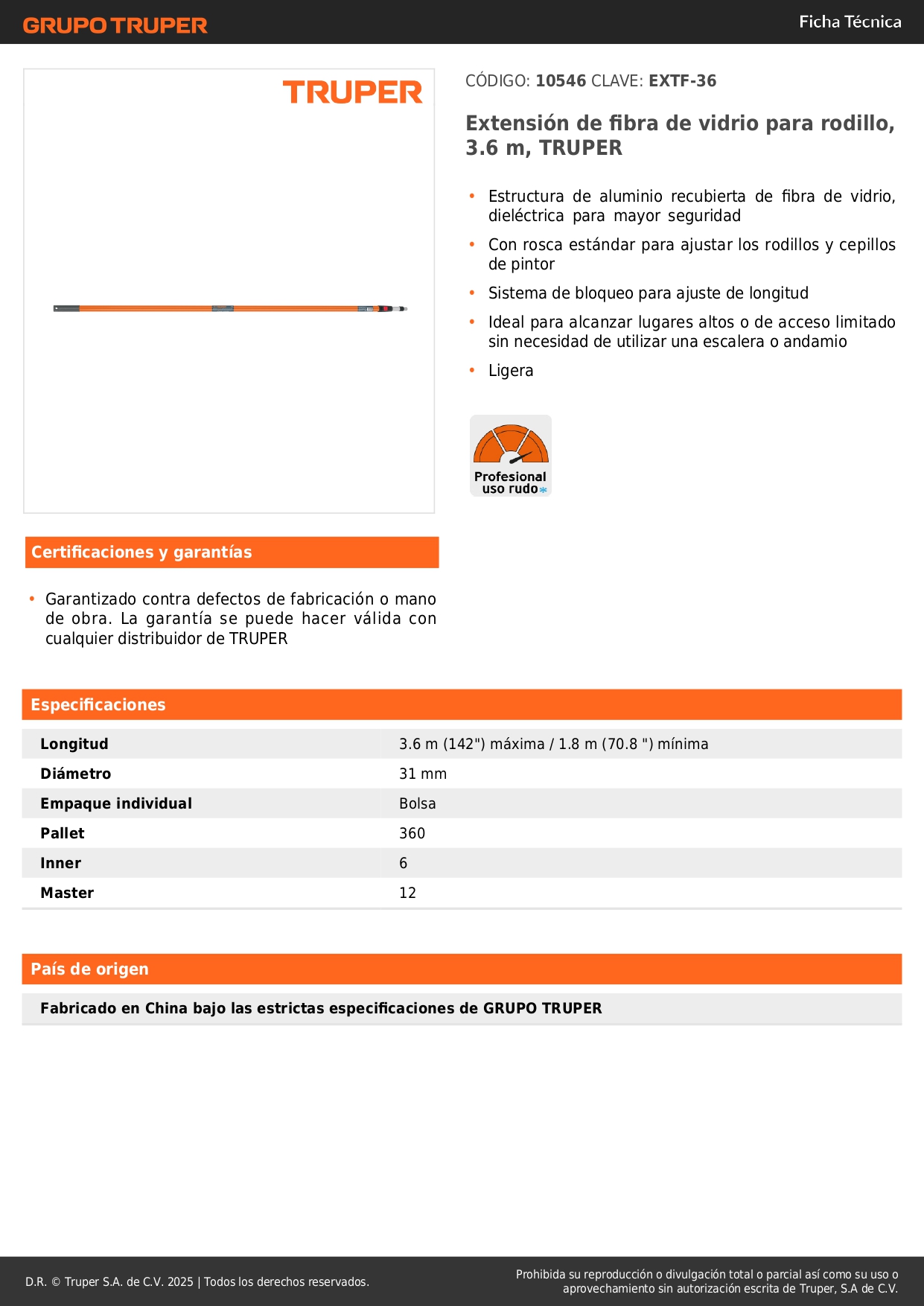 Extensión de 3.6 m de fibra de vidrio para rodillo, truper