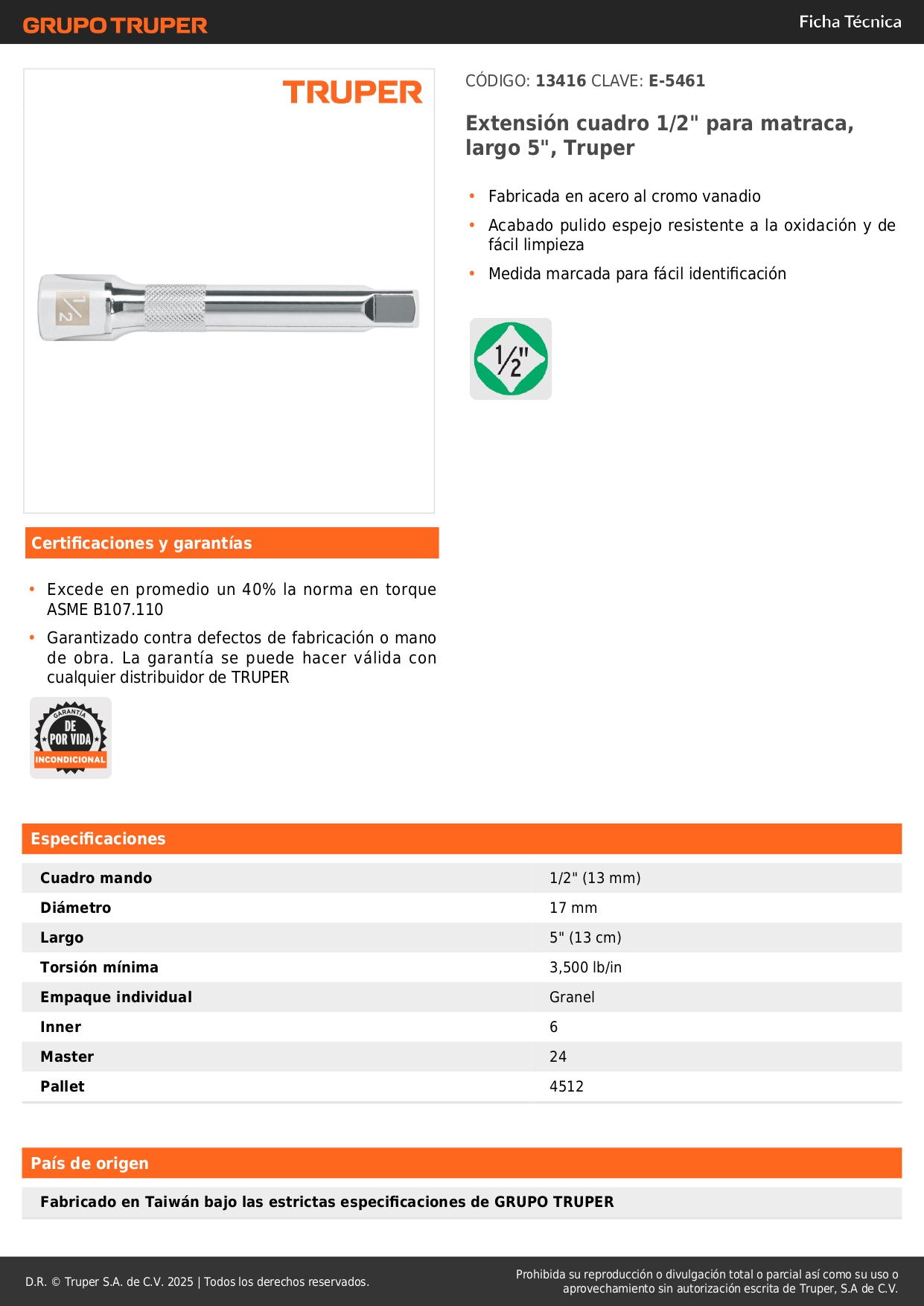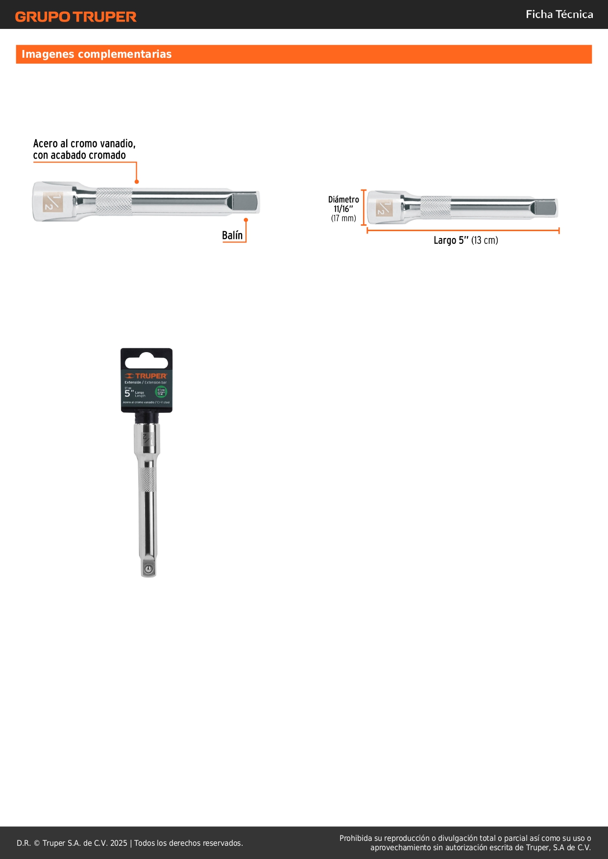 Extensión de 5'' para ratchet para dados encastre 1/2'' truper S/ 12.50 Agregar al carro Avísame cuando llegue -Fabricada en acero al cromo vanadio-Acabado pulido espejo resistente a la oxidación y de fácil limpieza-Medida marcada para fácil identificación