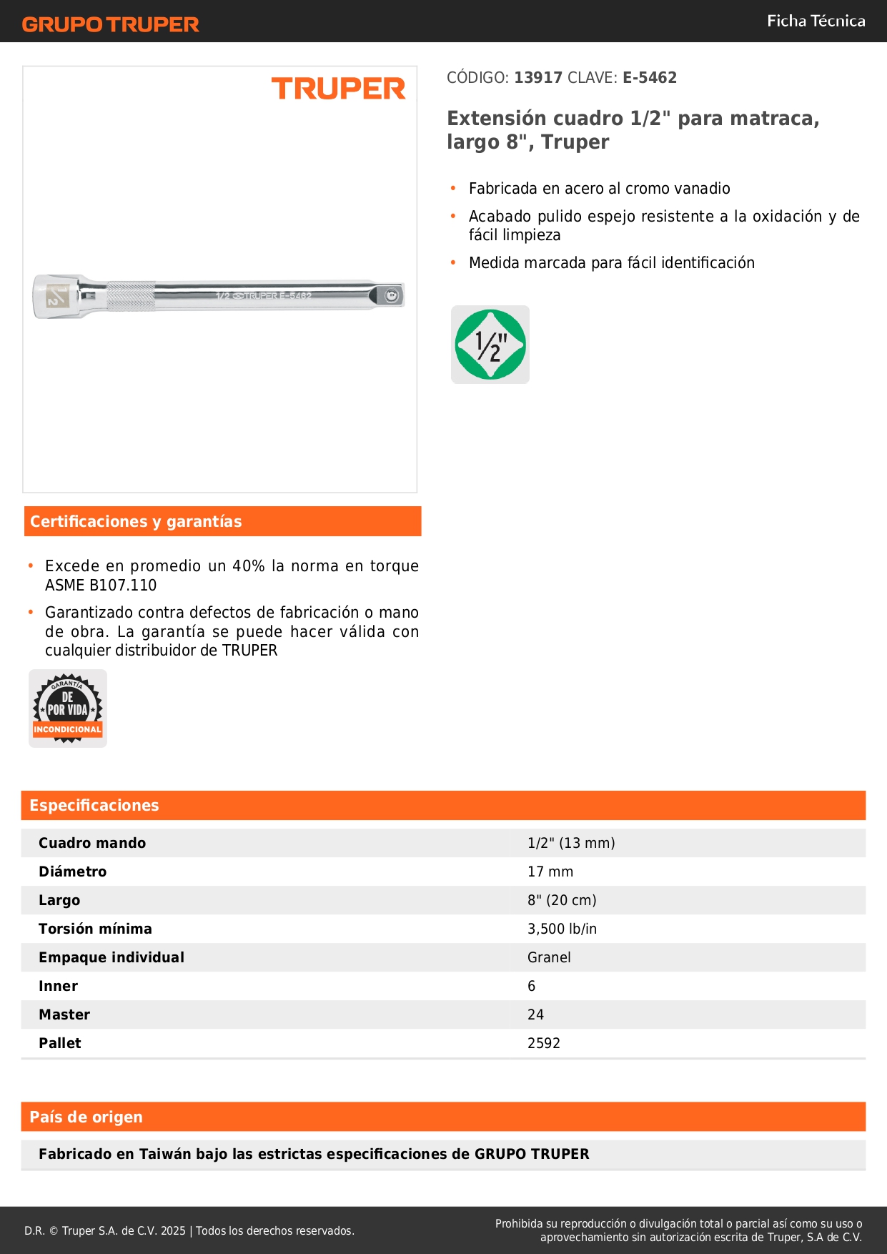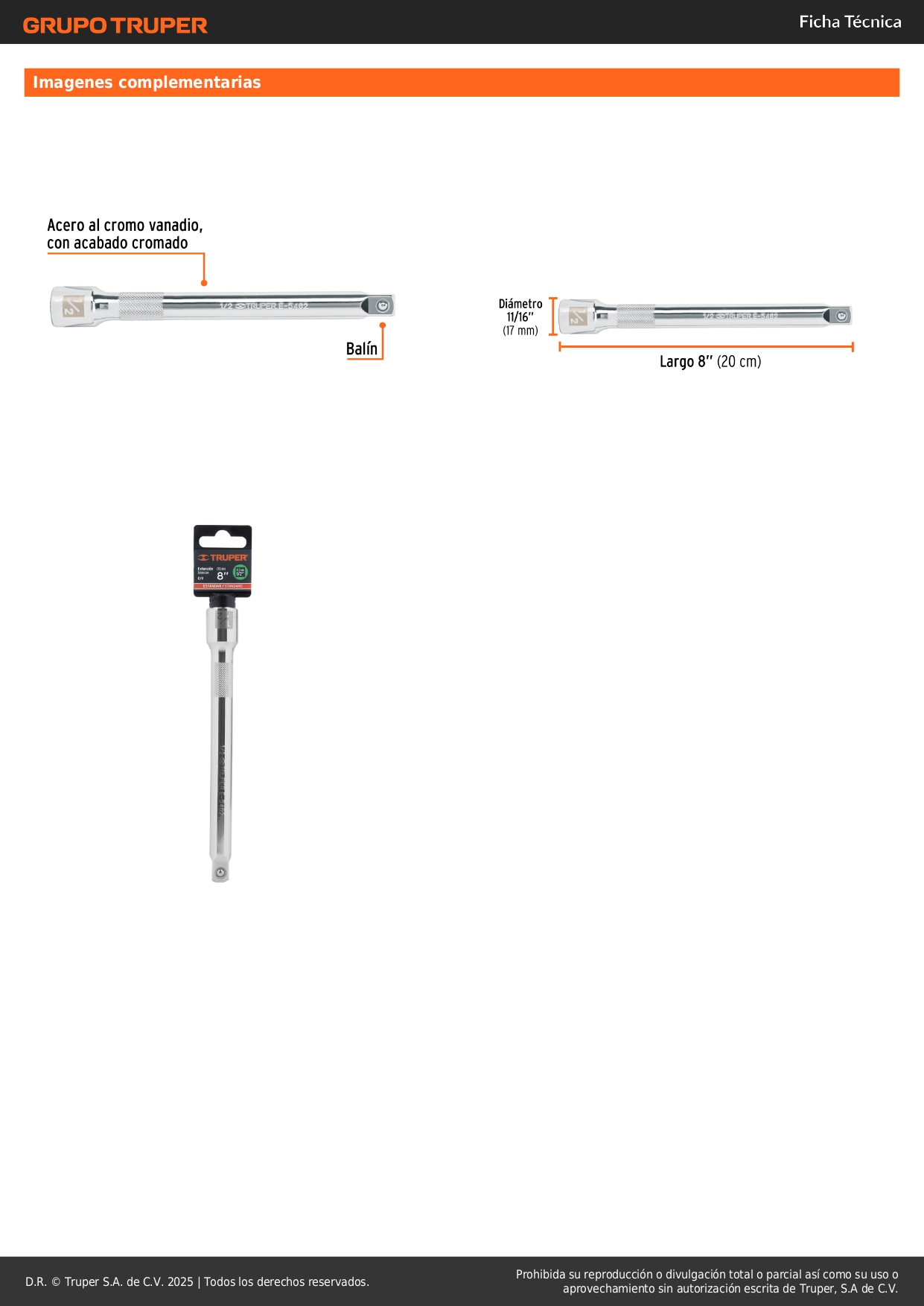 Extensión de 8'' para ratchet para dados encastre 1/2'' truper S/ 19.50 Agregar al carro Avísame cuando llegue -Fabricada en acero al cromo vanadio-Acabado pulido espejo resistente a la oxidación y de fácil limpieza-Medida marcada para fácil identificación
