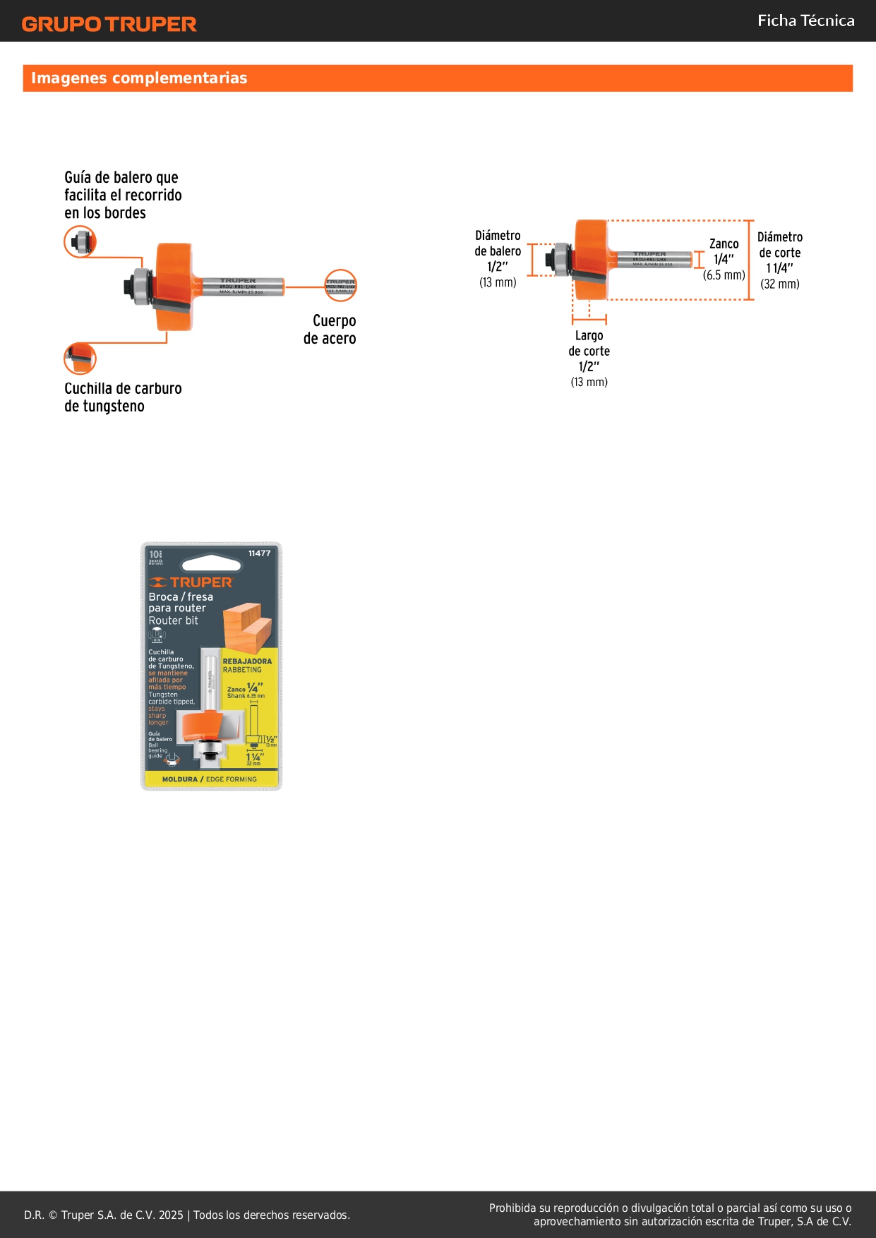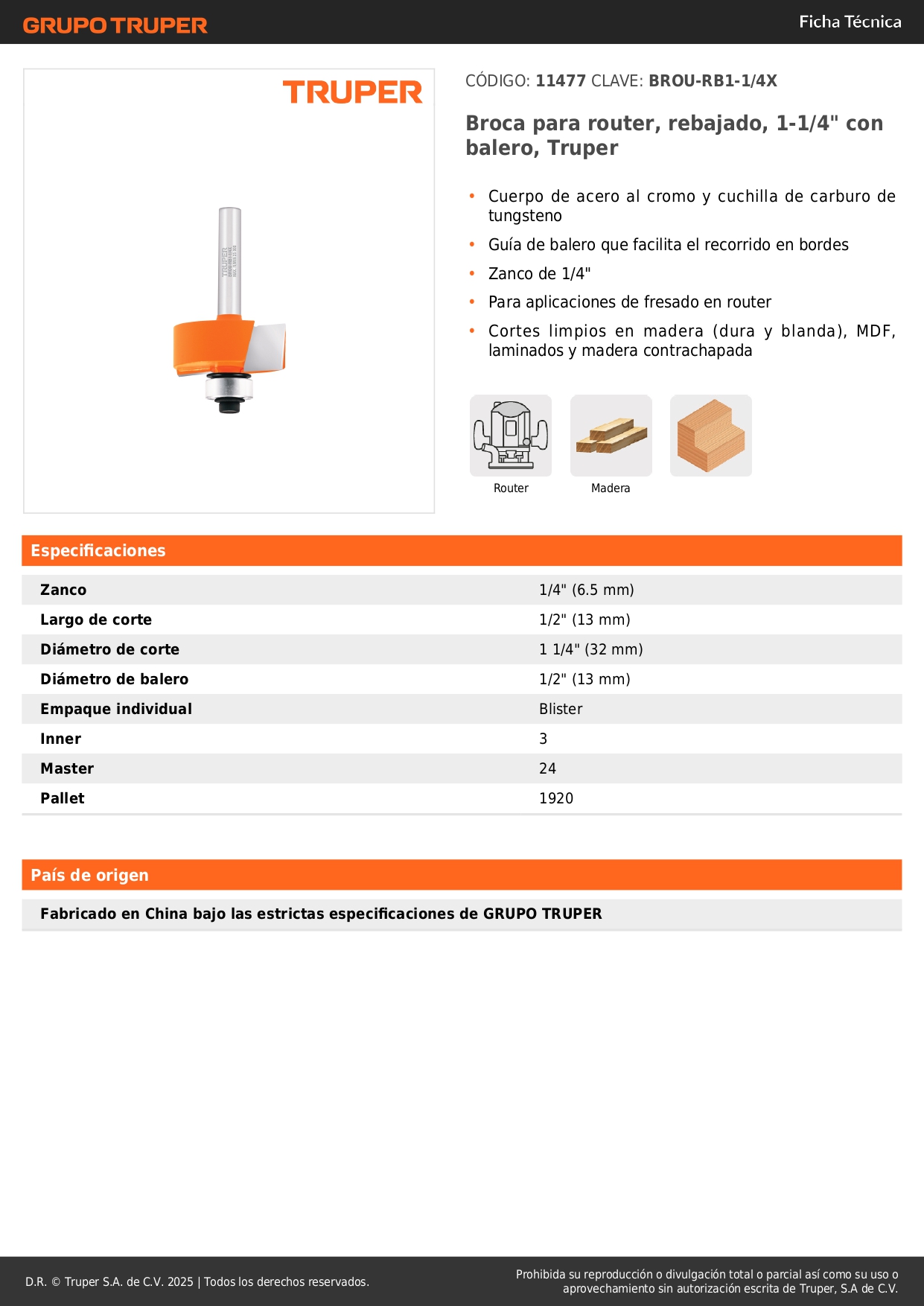 Fresa rebajadora, 1-1/4´´ con rodaje, truper