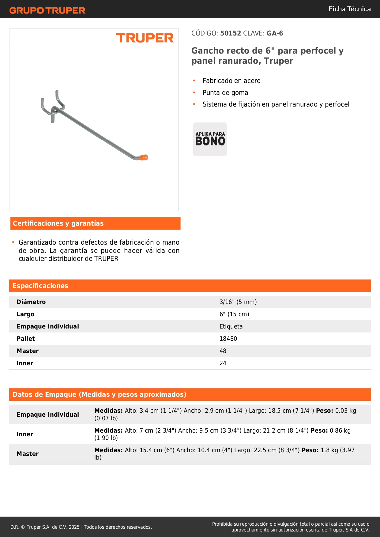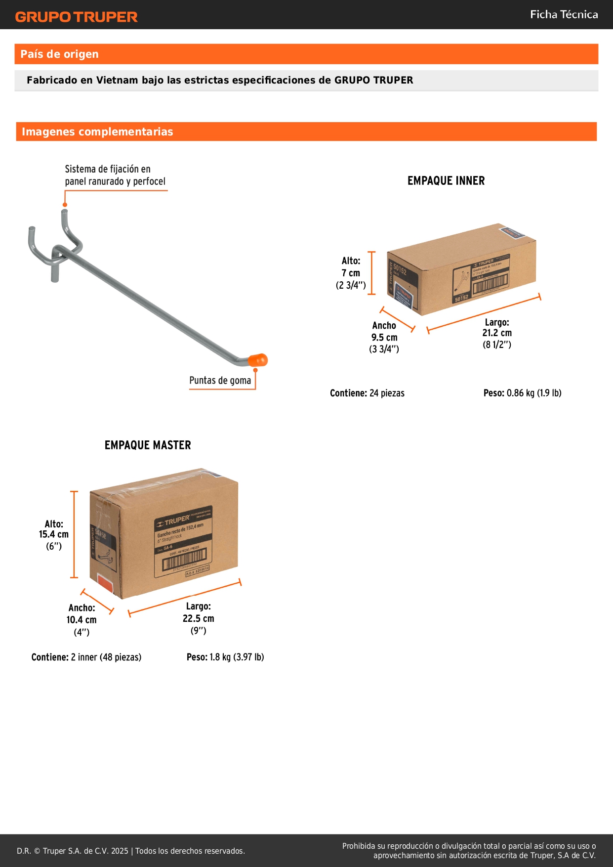 Gancho recto de 6´´ para perfocel y panel ranurado, truper S/ 2.40 Agregar al carro Avísame cuando llegue -Fabricado en acero-Punta de goma-Sistema de fijación en panel ranurado y perfocel