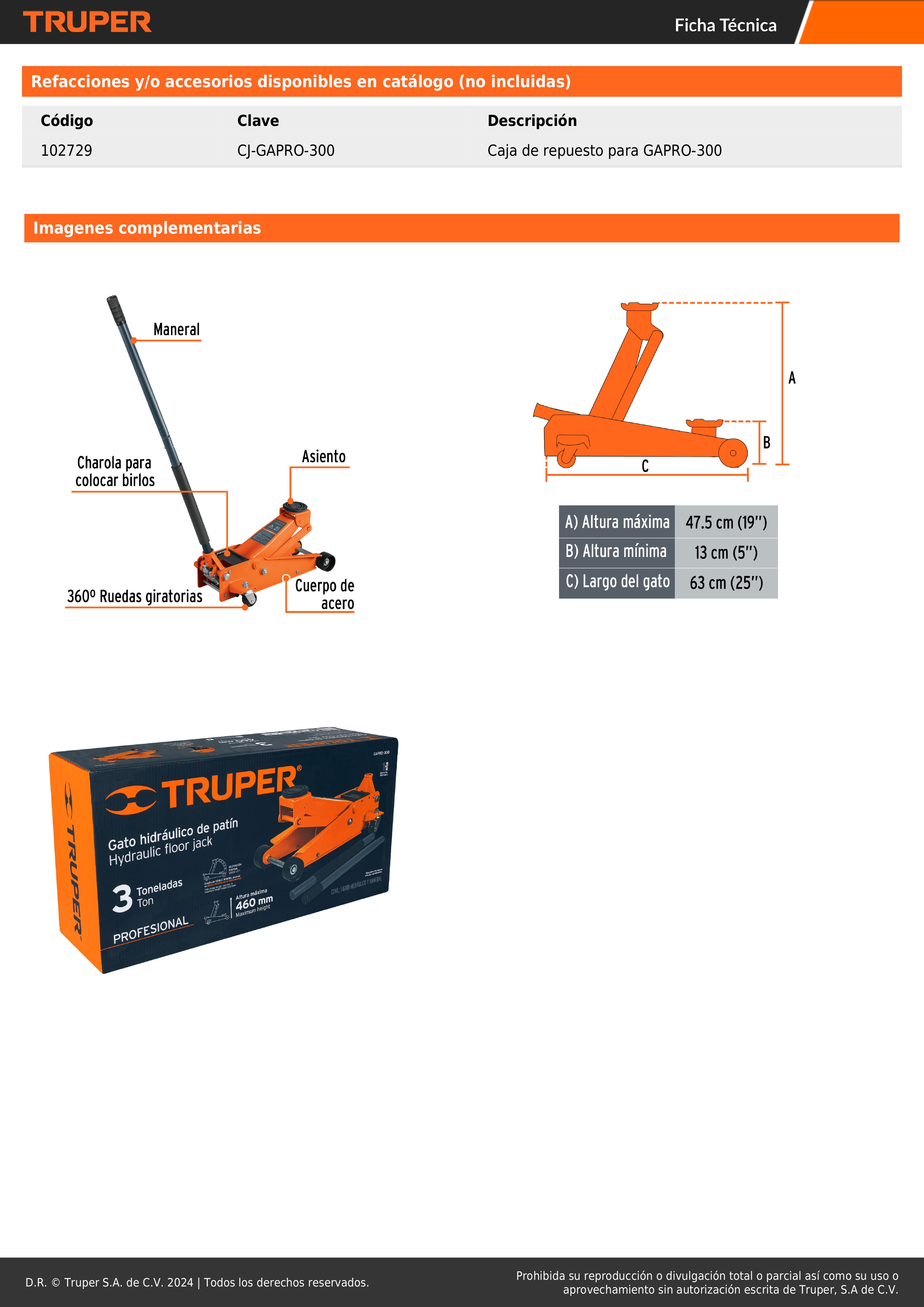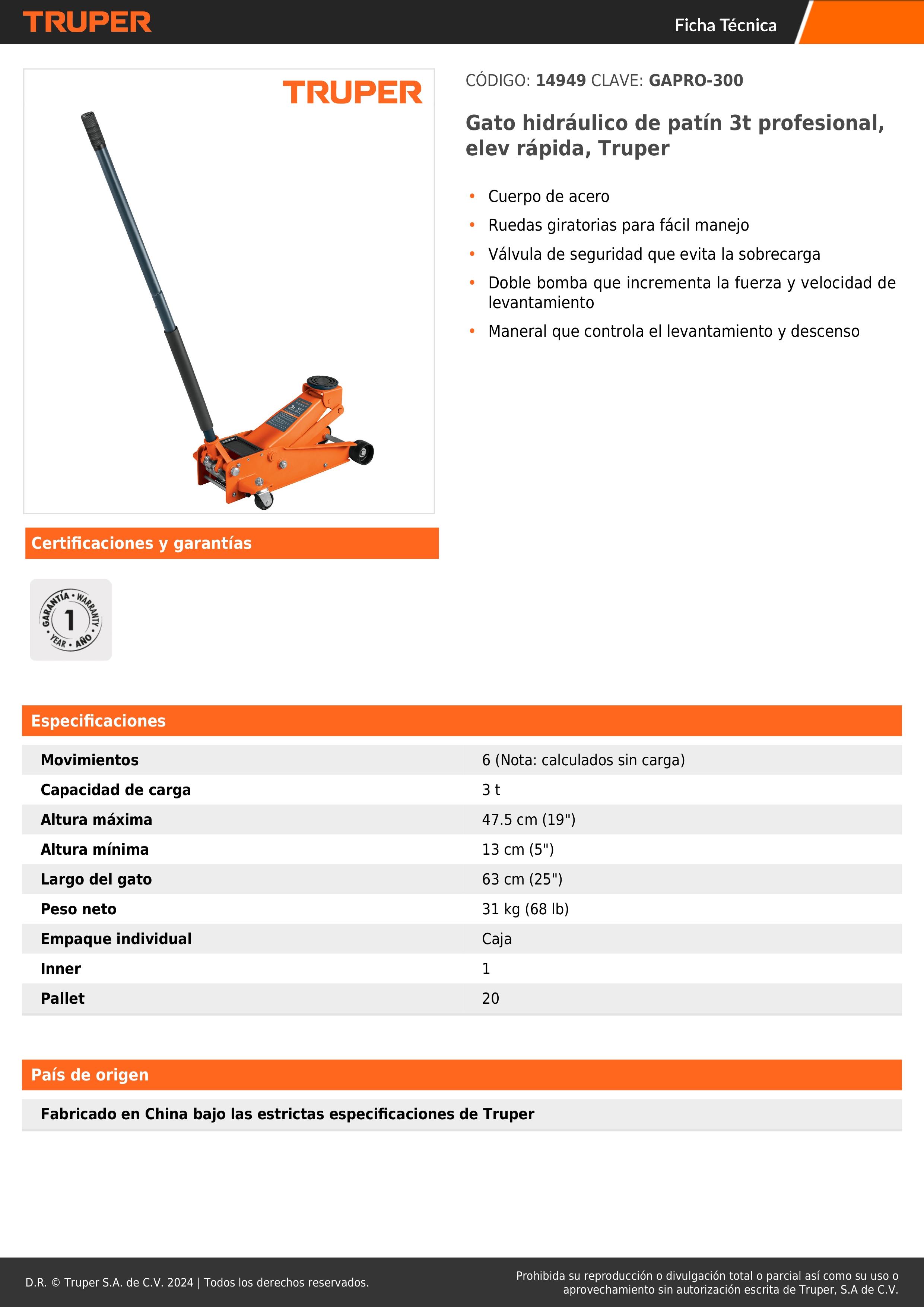 Gato hidráulico de patín 3t profesional, elev rápida, Truper