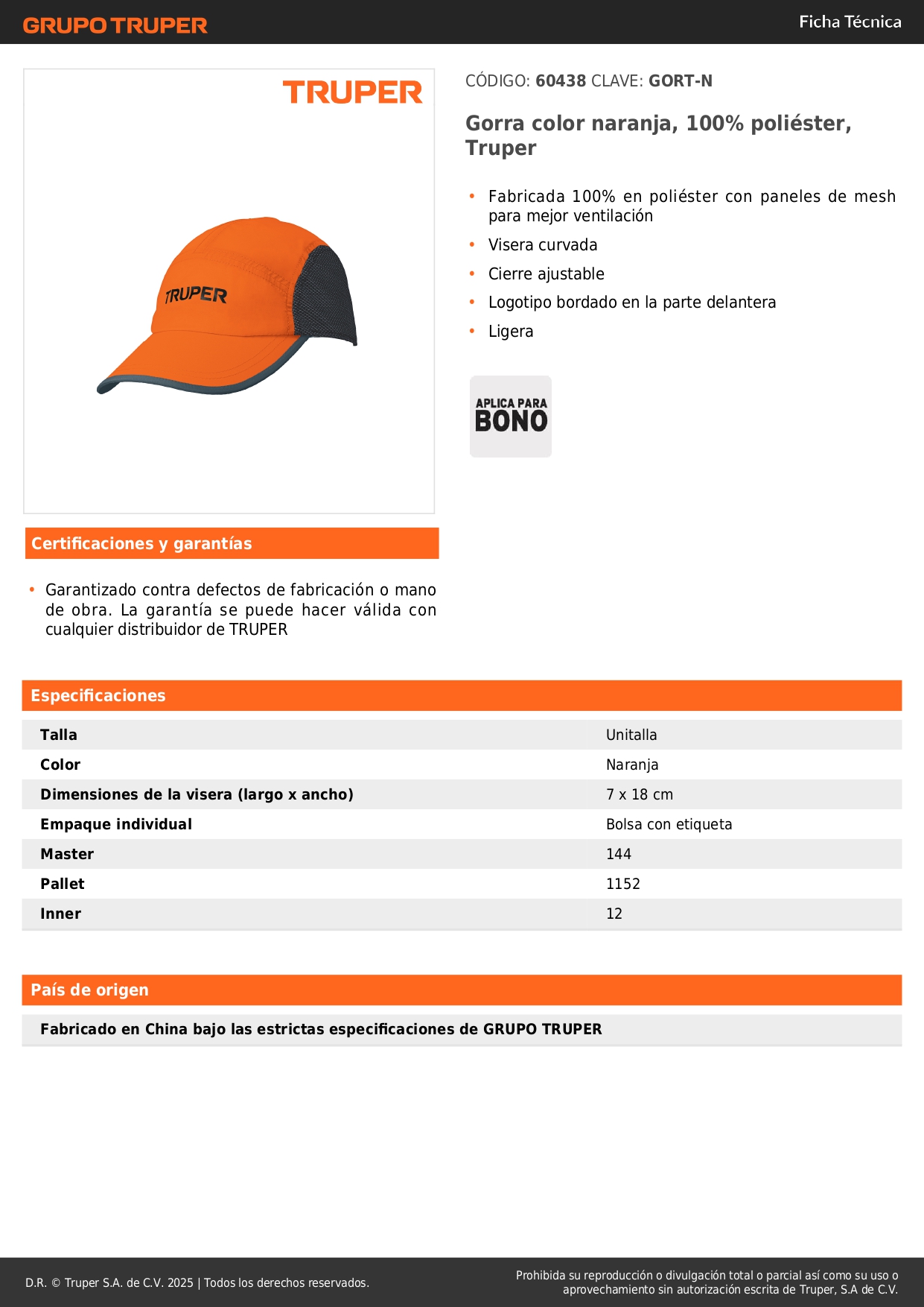 Gorra truper color naranja, 100% poliéster respirable S/ 18.30 Agregar al carro Avísame cuando llegue -Fabricada 100% en poliéster con paneles de mesh para mejor ventilación-Visera curvada-Cierre ajustable-Logotipo bordado en la parte delantera-Ligera