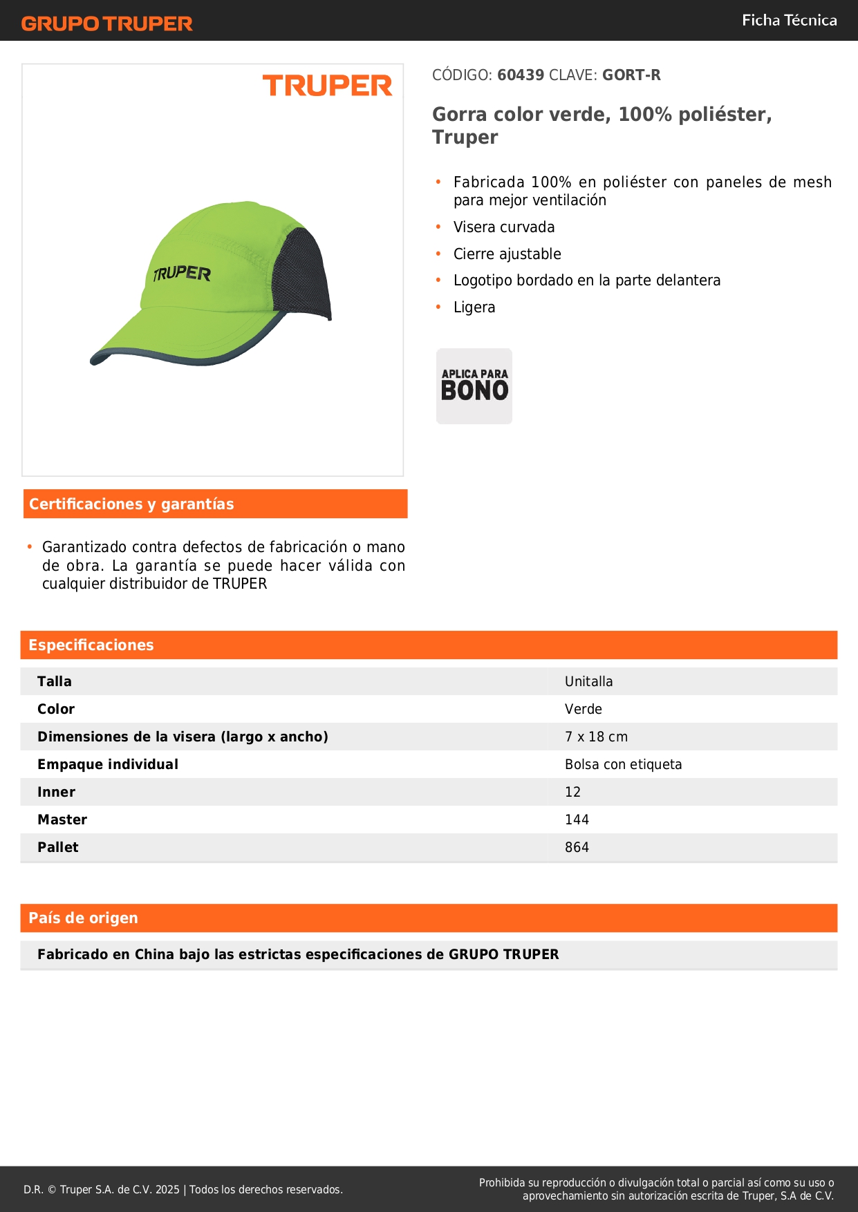 Gorra truper color verde, 100% poliéster respirable S/ 18.30 Agregar al carro Avísame cuando llegue -Fabricada 100% en poliéster con paneles de mesh para mejor ventilación-Visera curvada-Cierre ajustable-Logotipo bordado en la parte delantera-Ligera