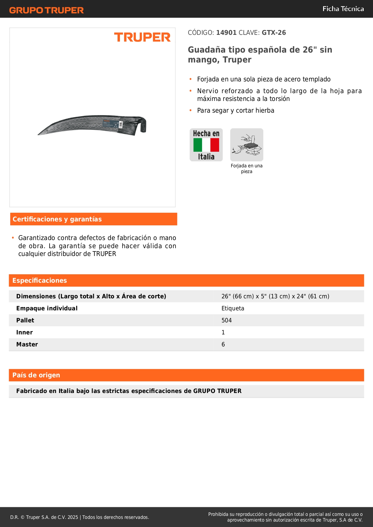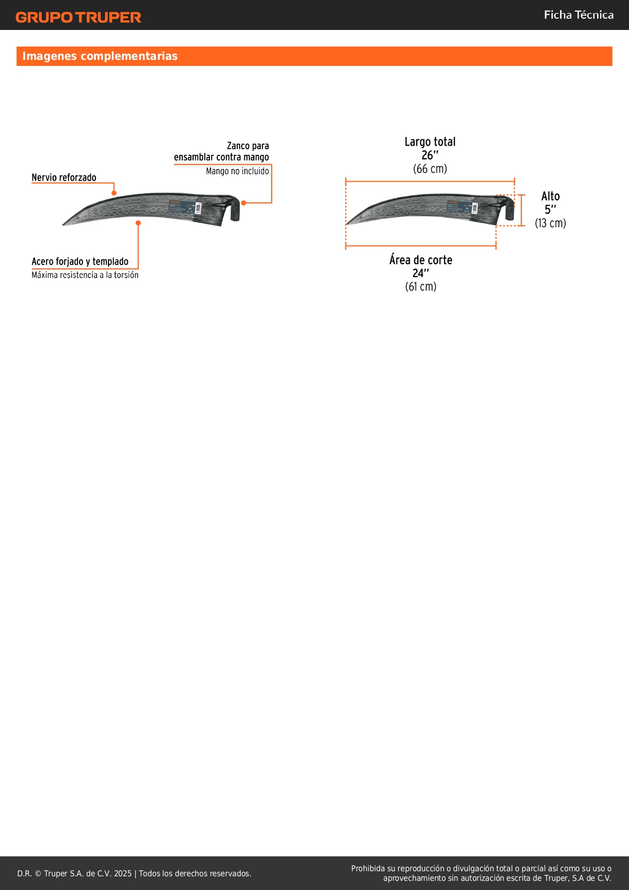 Guadaña tipo española de 26" sin mango, Truper