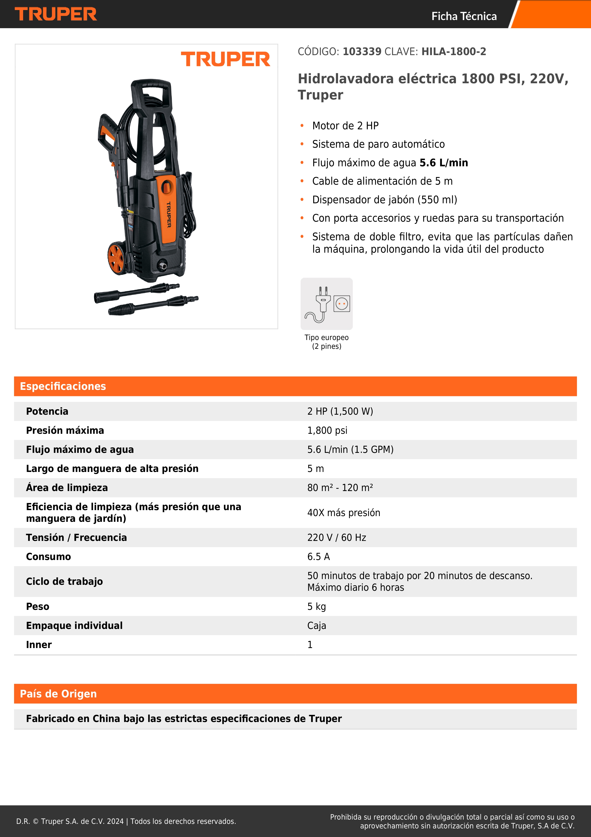 Hidrolavadora eléctrica 1800 PSI, 220V, Truper