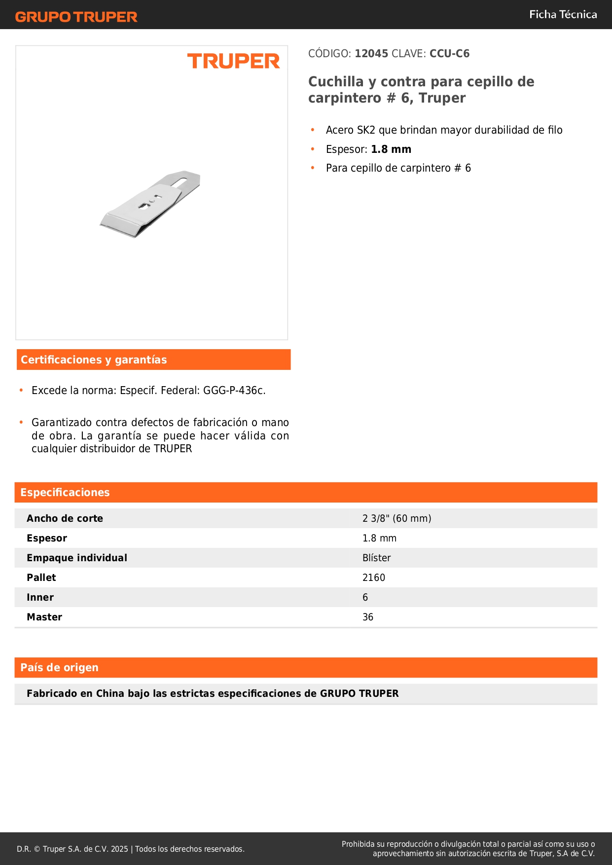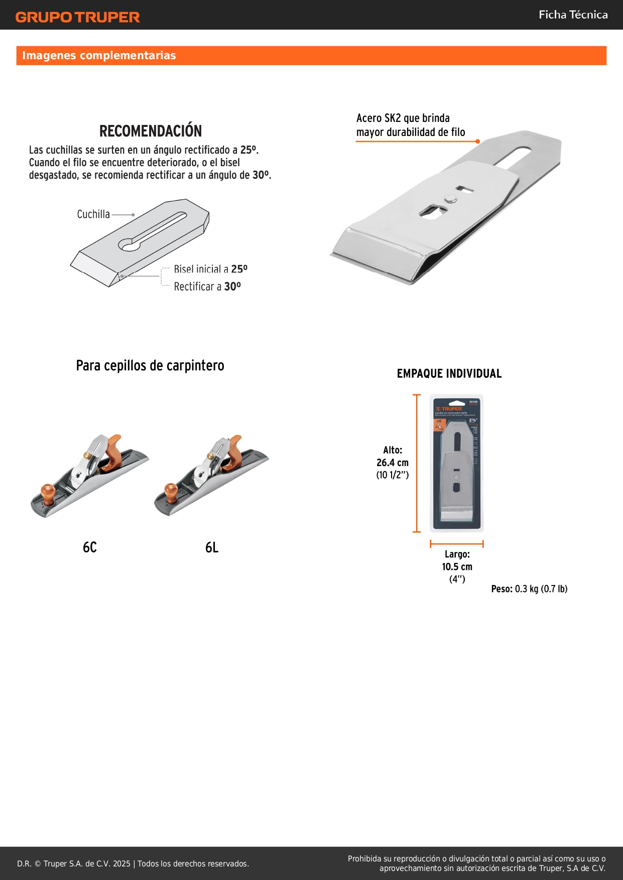 Cuchilla y contra para cepillo de carpintero # 6, Truper