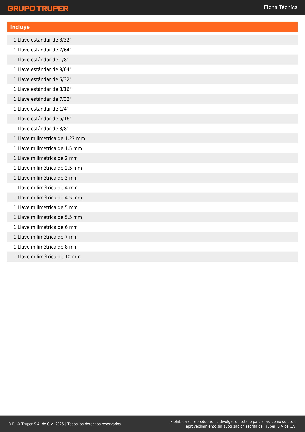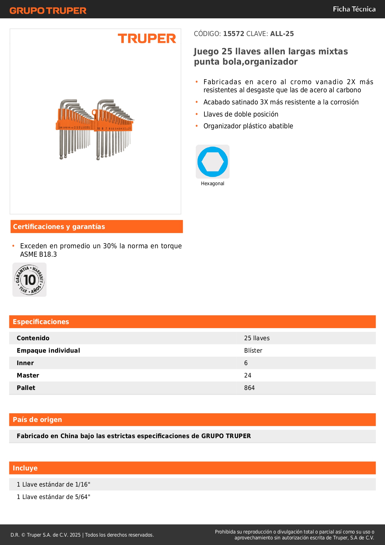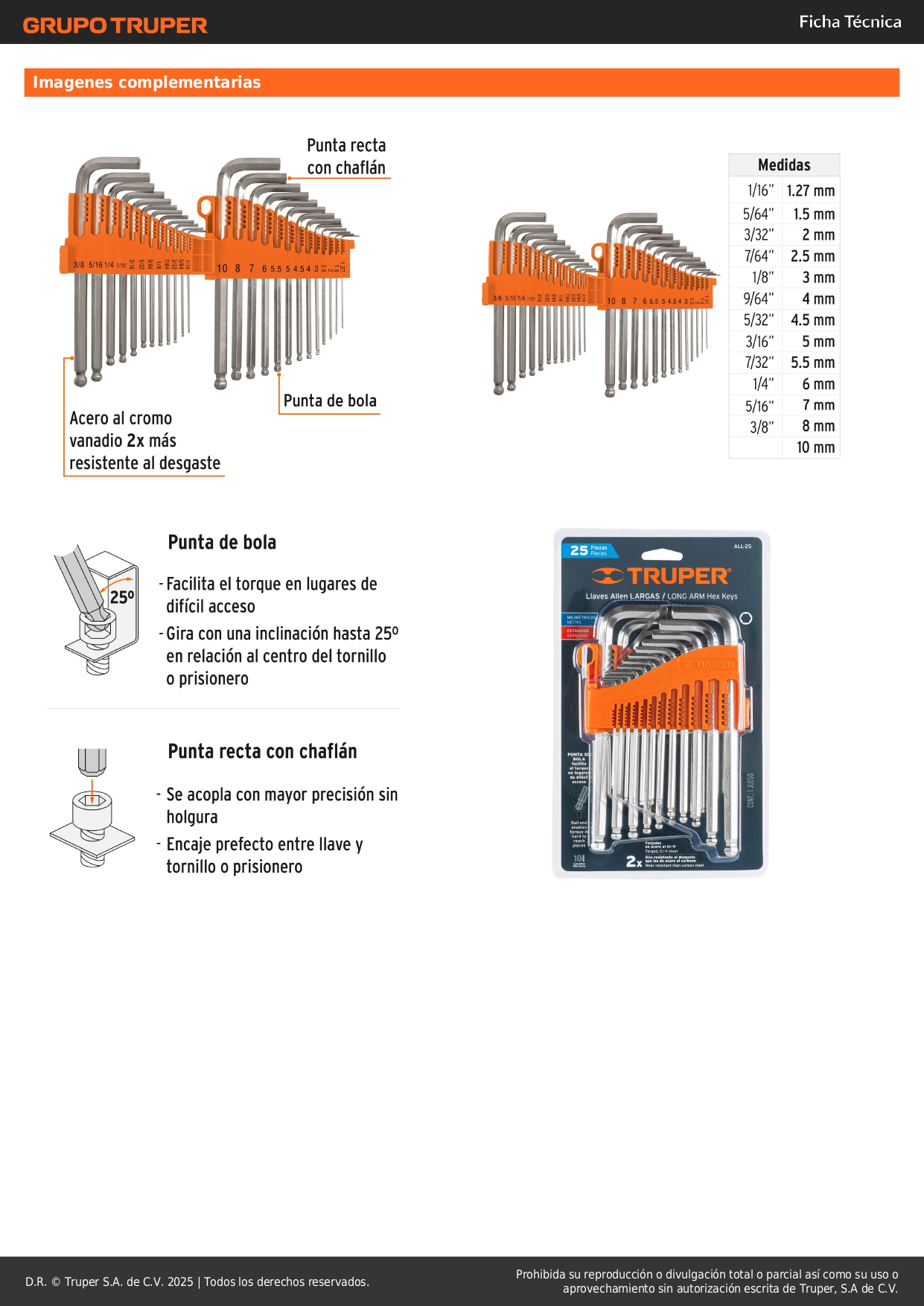 Juego 25 llaves allen largas std y mm punta bola organizador truper