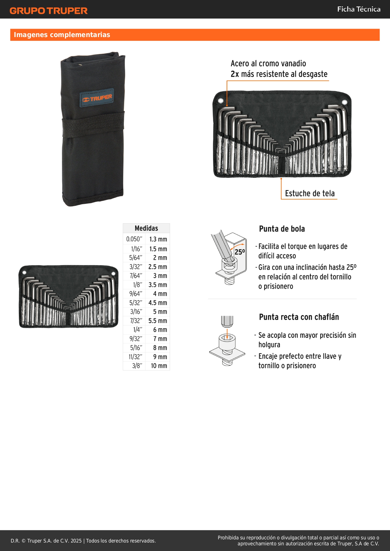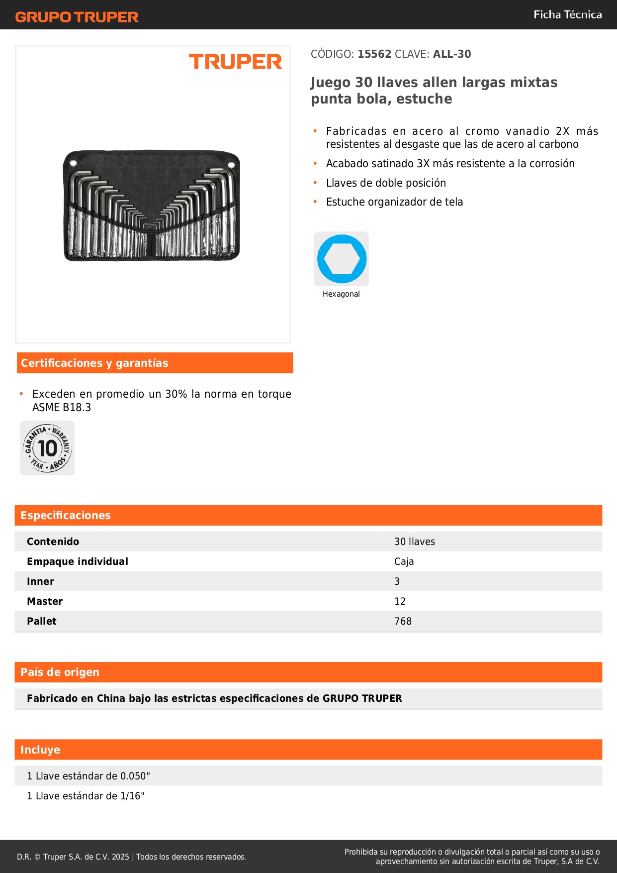 Juego 30 llaves allen largas std y mm punta bola, estuche truper