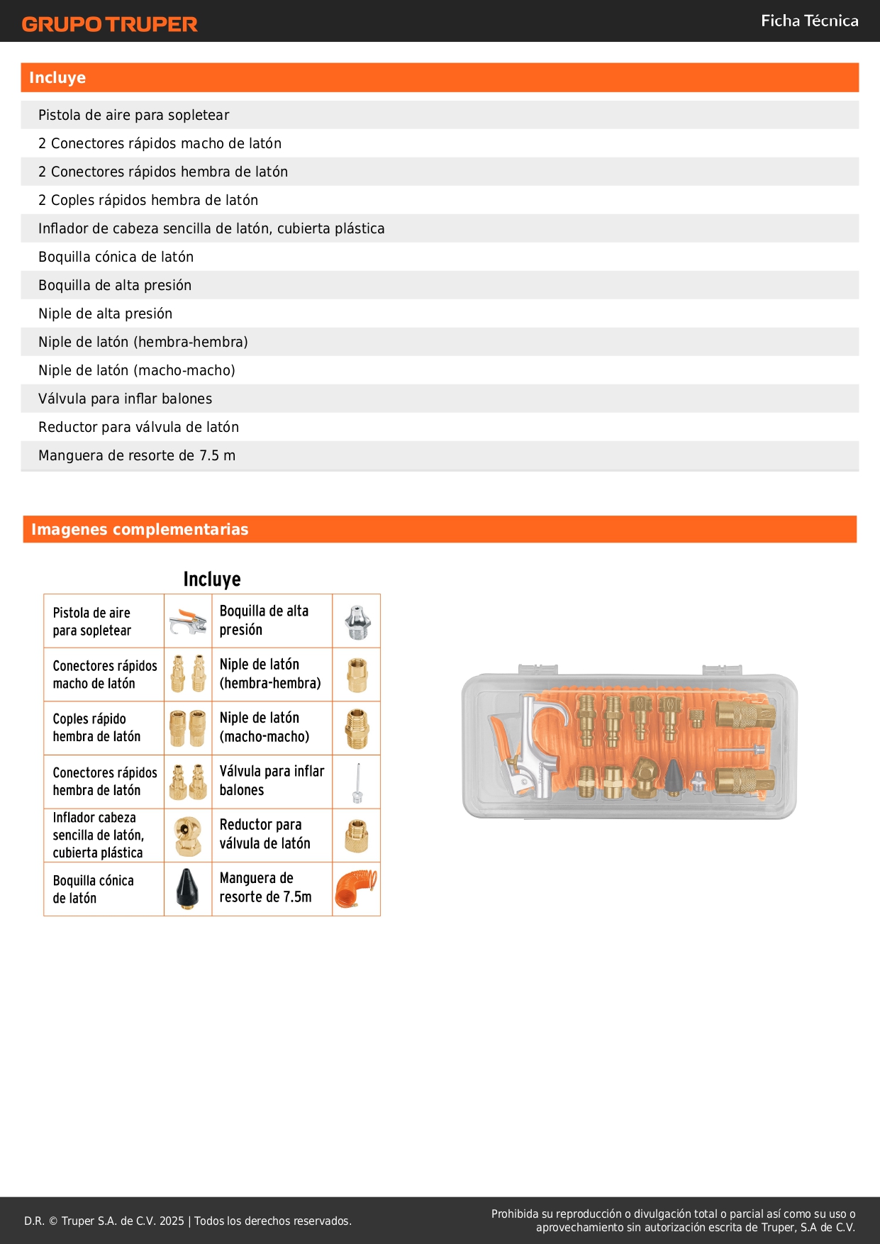 • Conectores, coples, niples, boquilla cónica, inflador y