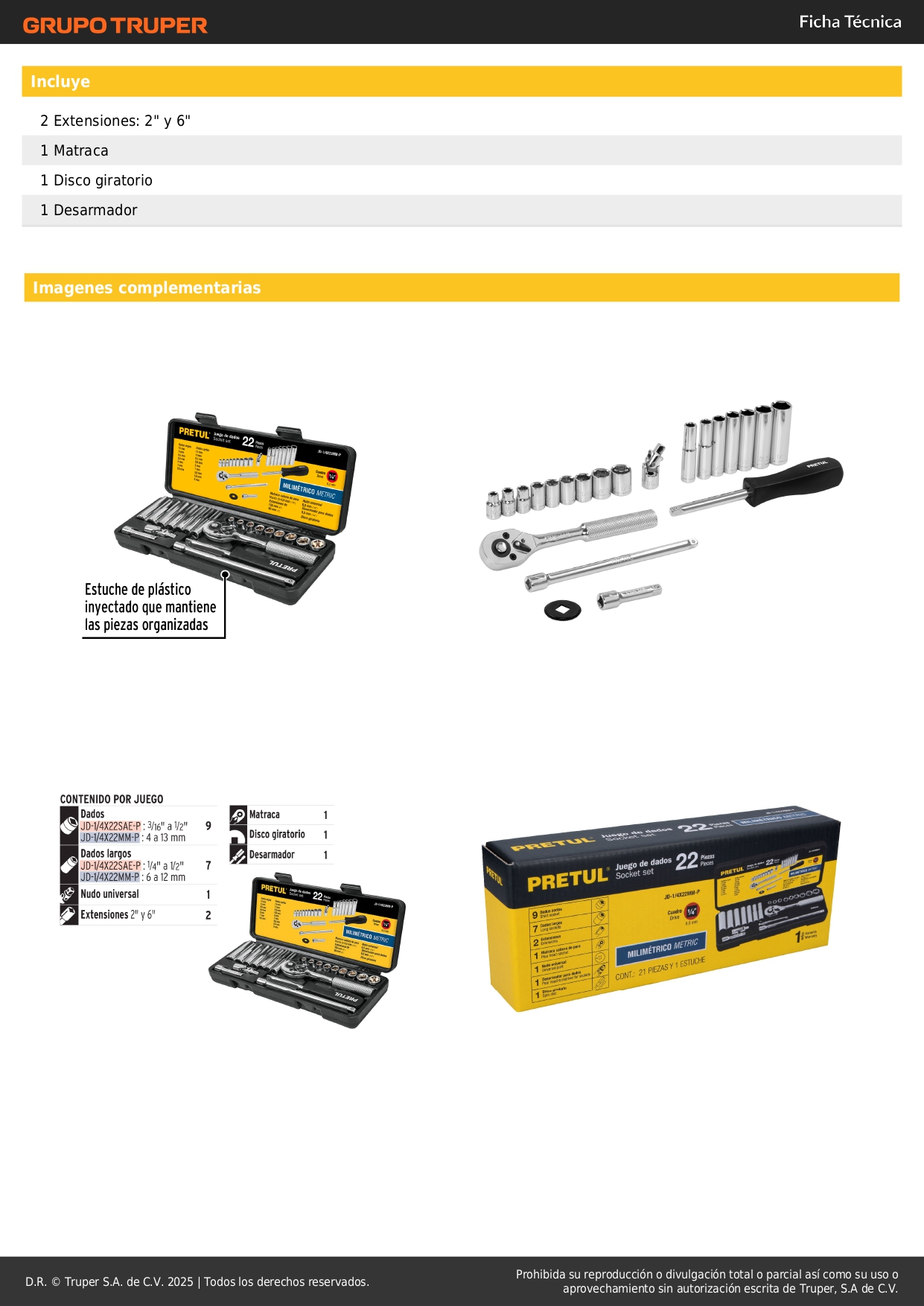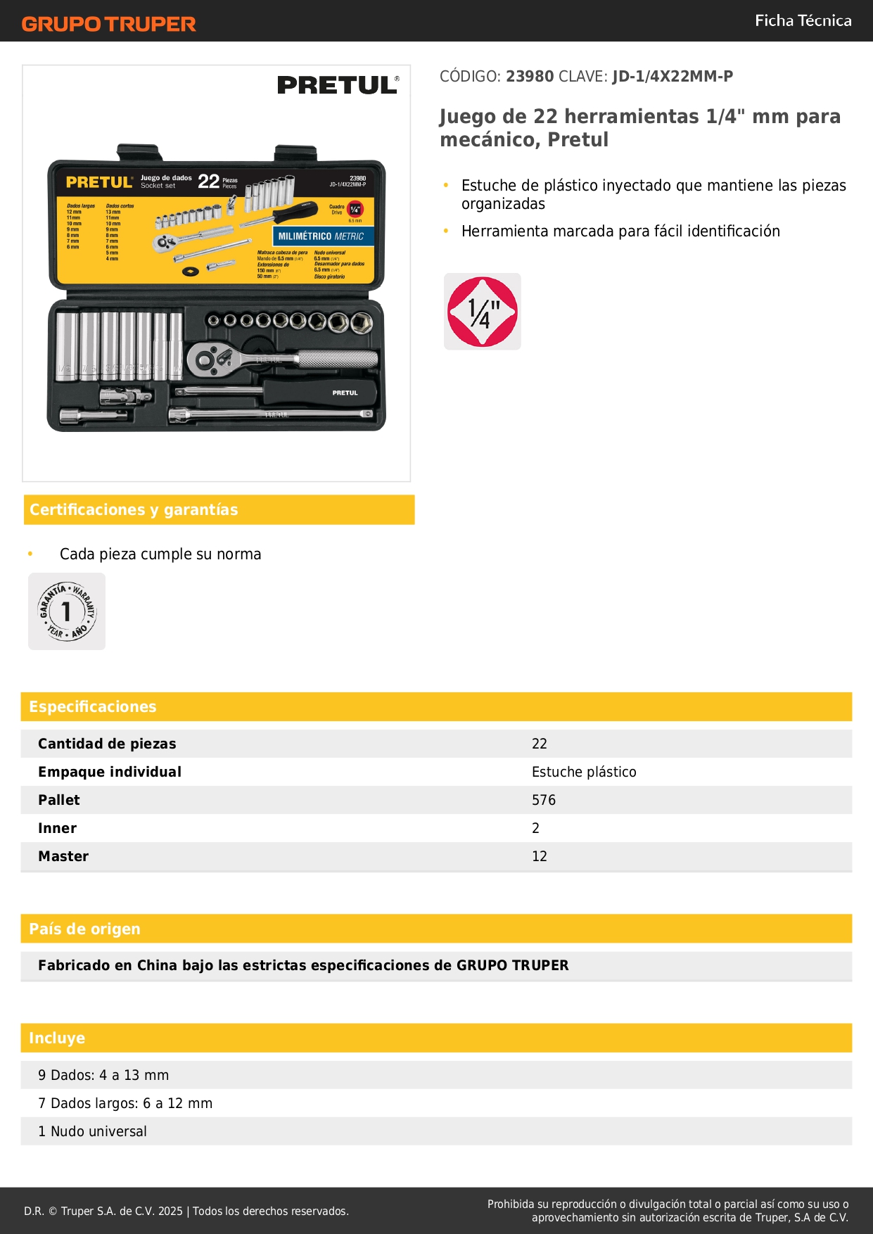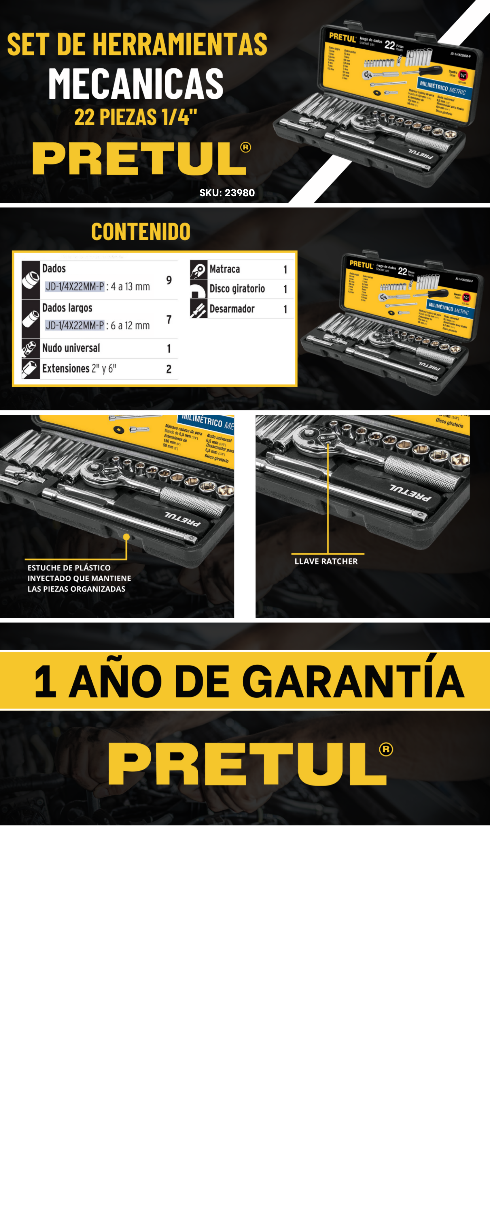 Juego de 22 herramientas 1/4" mm para mecánico, Pretul