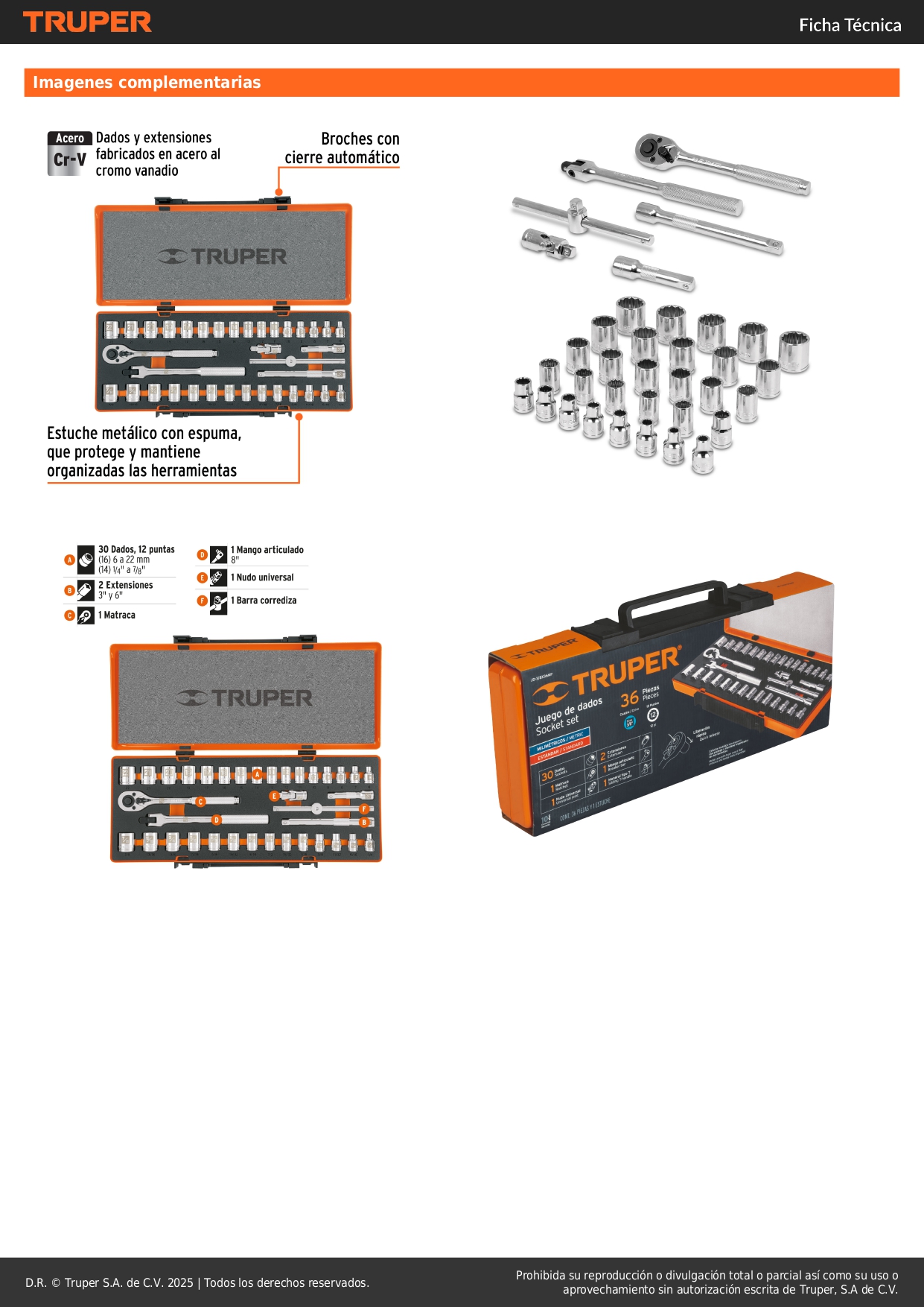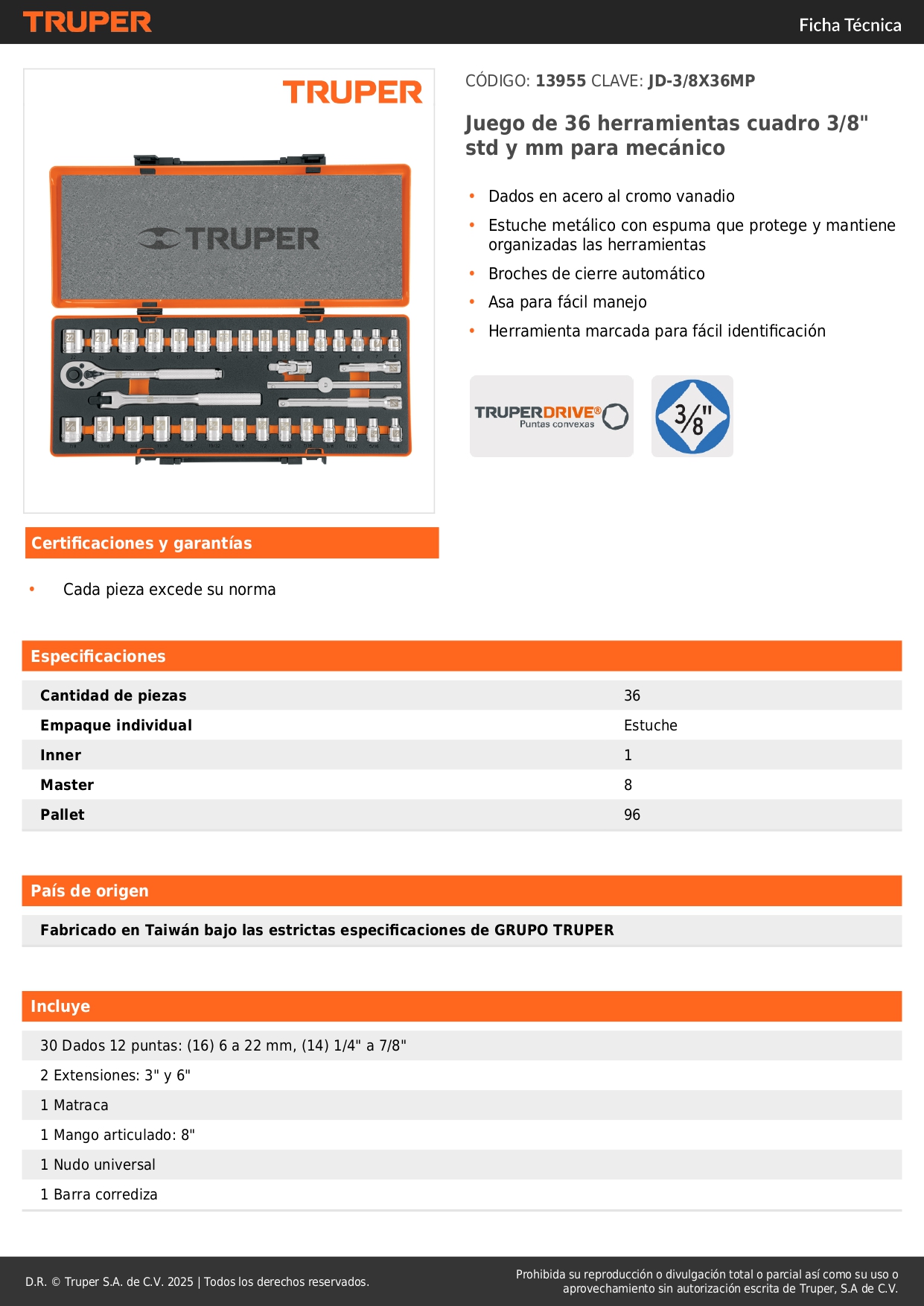 Juego de 36 herramientas cuadro 3/8´´ std y mm para mecánico truper