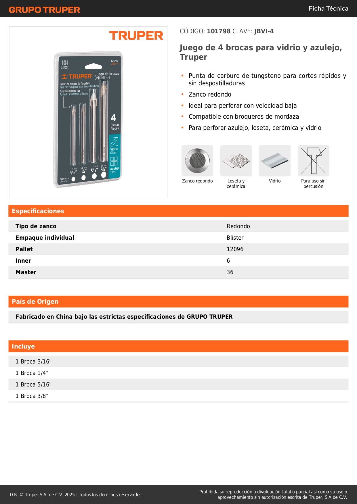 Juego de 4 brocas para vidrio y azulejo, Truper