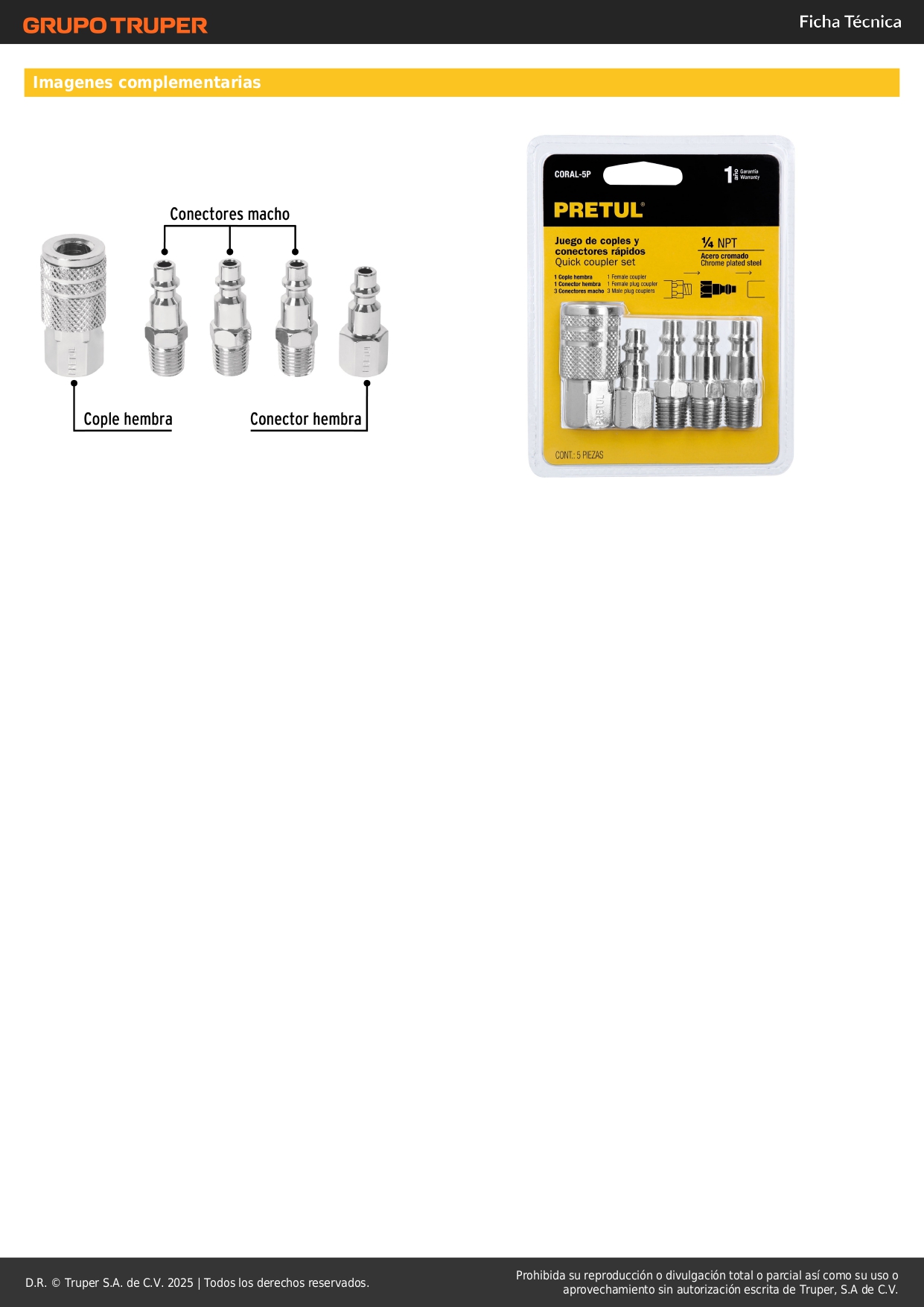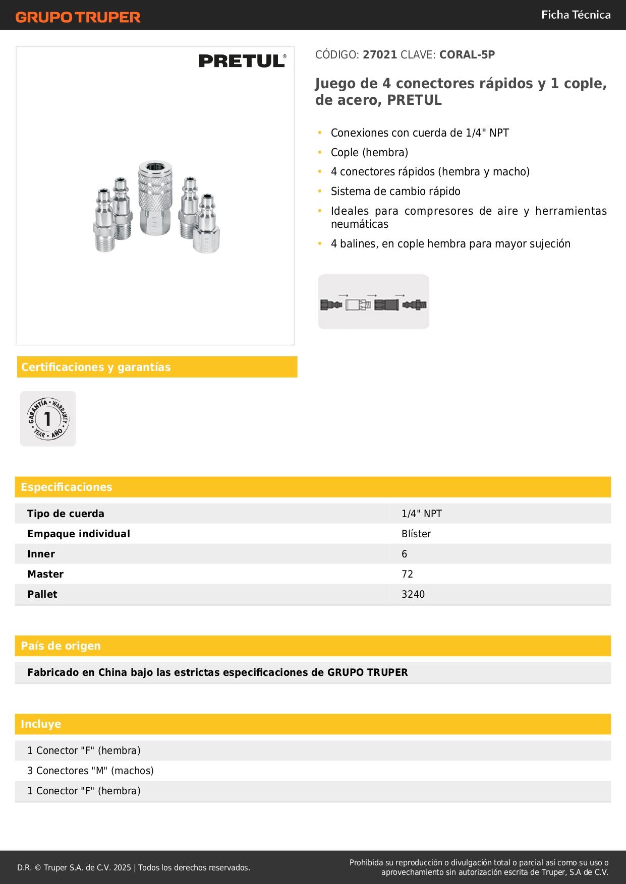 Juego de 4 conectores y 1 acople para compresora, pretul S/ 12.80 Agregar al carro Avísame cuando llegue -Conexiones con cuerda de 1/4" NPT-Cople (hembra)-4 conectores rápidos (hembra y macho)-Sistema de cambio rápido-Ideales para compresores de aire y herramientas neumáticas