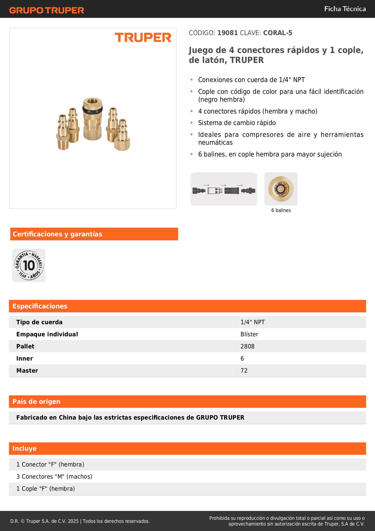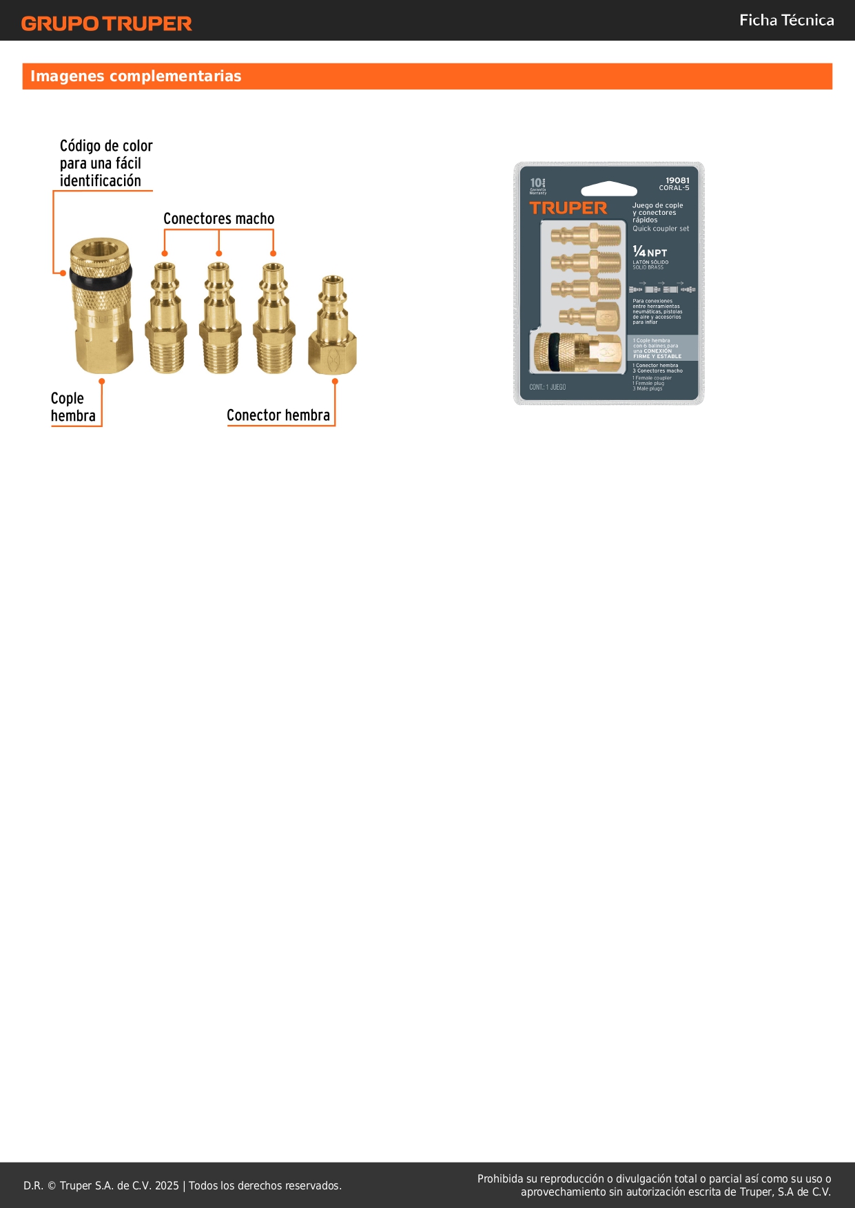 Juego de 4 conectores y 1 acople para compresora, truper