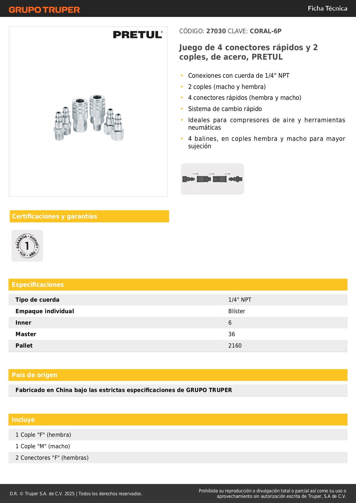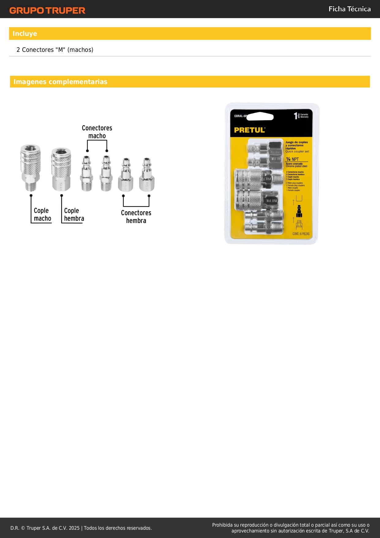 Juego de 4 conectores y 2 coples, compresor de aire, Pretul