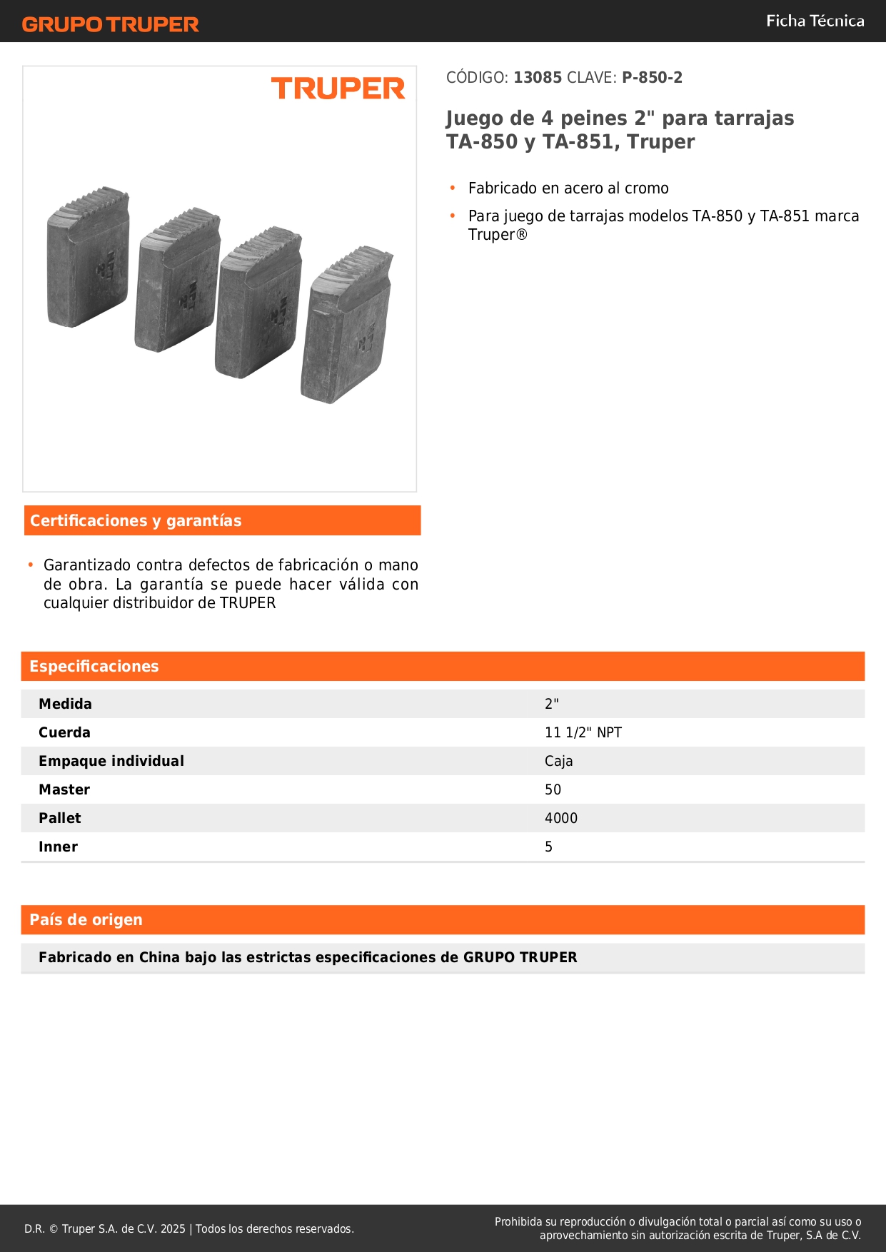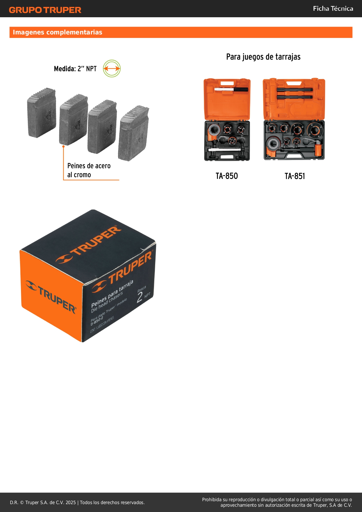 Juego de 4 peines 2´´ para tarrajas ta-850 y ta-851, truper S/ 20.60 Agregar al carro Avísame cuando llegue -Fabricado en acero al cromo-Para juego de tarrajas modelos TA-850 y TA-851 marca Truper®