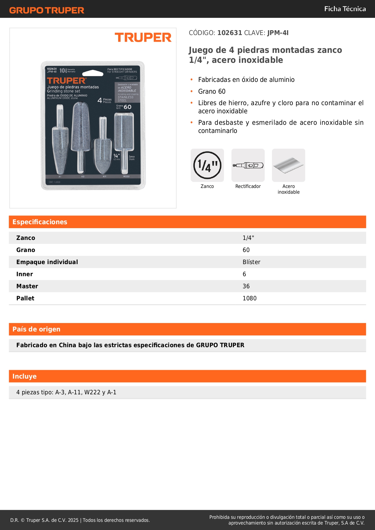 Juego de 4 piedras montadas zanco 1/4', acero inoxidable truper S/ 23.00 Agregar al carro Avísame cuando llegue -Fabricadas en óxido de aluminio-Grano 60-Libres de hierro, azufre y cloro para no contaminar el acero inoxidable-Para desbaste y esmerilado de acero inoxidable sin contaminarlo