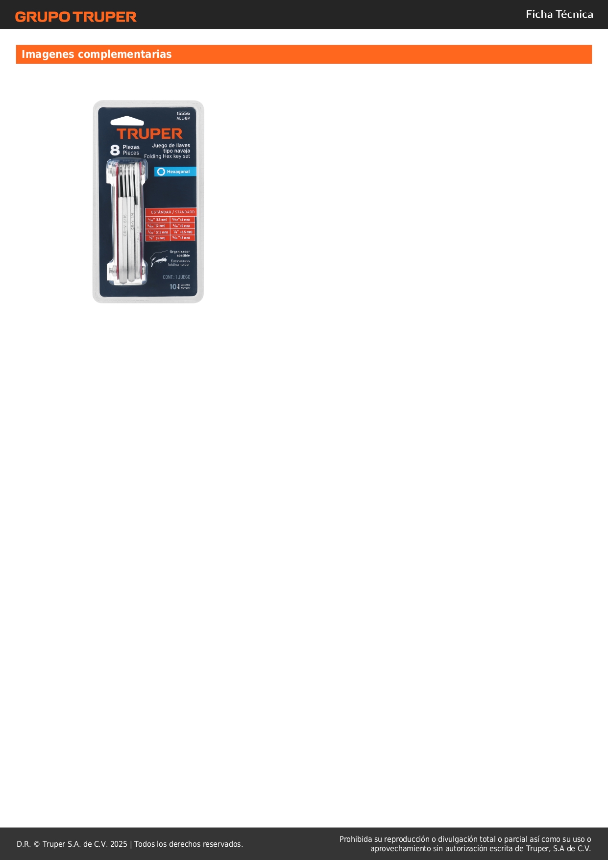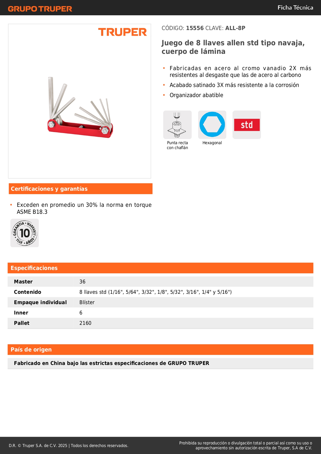 Juego de 8 llaves allen std tipo navaja, cuerpo de lámina truper S/ 14.70 Agregar al carro Avísame cuando llegue -Fabricadas en acero al cromo vanadio 2X más resistentes al desgaste que las de acero al carbono-Acabado satinado 3X más resistente a la corrosión-Organizador abatible